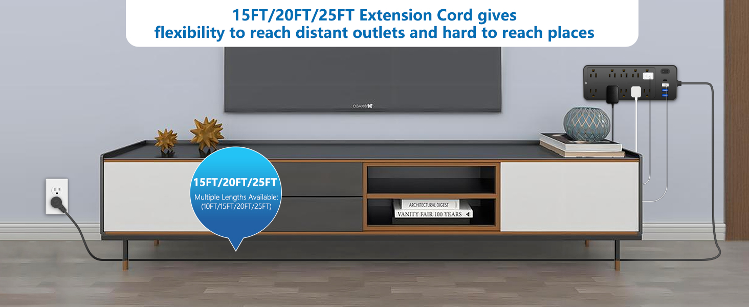سلك تمديد بطول 20 قدمًا مع قابس مسطح: يأتي سلك التمديد بطول 20 قدمًا مزودًا بقابس مسطح سهل الاستخدام، مما يسمح بالمرونة وسهولة التركيب. لا مزيد من المعاناة مع المقابس الضخمة أو توفر المقابس المحدودة. بالإضافة إلى ذلك، يأتي شريط الطاقة مع روابط كابل تثبيت قابلة لإعادة الاستخدام لتنظيم السلك بشكل أفضل.