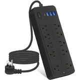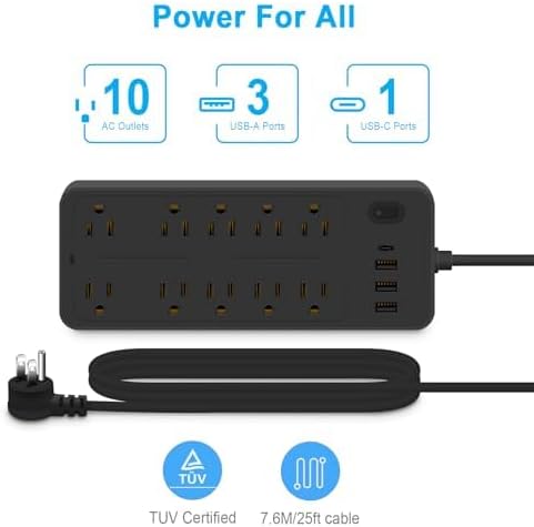شريط طاقة متطور مع 10 منافذ تيار متردد و4 منافذ USB: يوفر شريط الطاقة الخاص بنا 10 منافذ تيار متردد و4 منافذ USB، بما في ذلك منفذ USB-C (5 فولت/2.1 أمبير)، لتلبية جميع احتياجات الطاقة الخاصة بك. مصمم خصيصًا لـ مكاتب الكمبيوتر والألعاب، فهي توفر مساحة واسعة لجميع أجهزتك الإلكترونية.