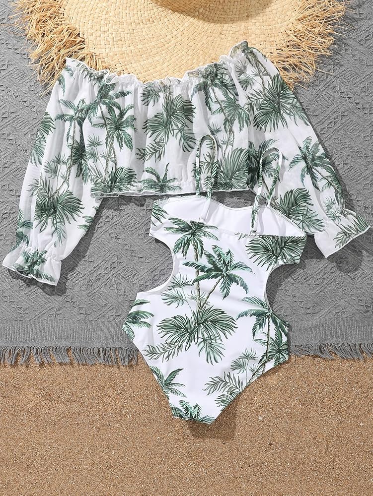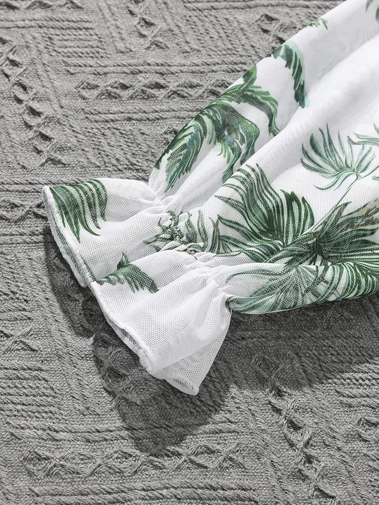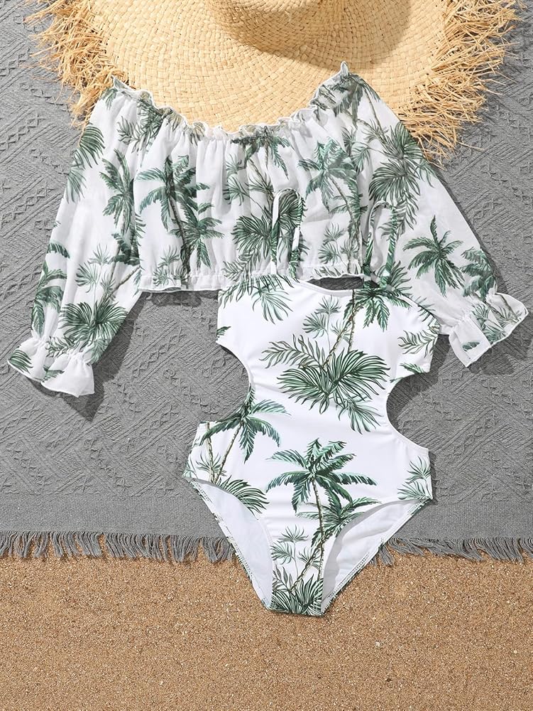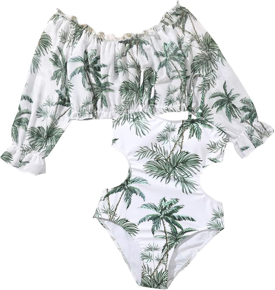 بدلة سباحة SHENHE للفتيات قطعة واحدة برقبة واسعة وطبعة استوائية مع أغطية علوية طويلة الأكمام
