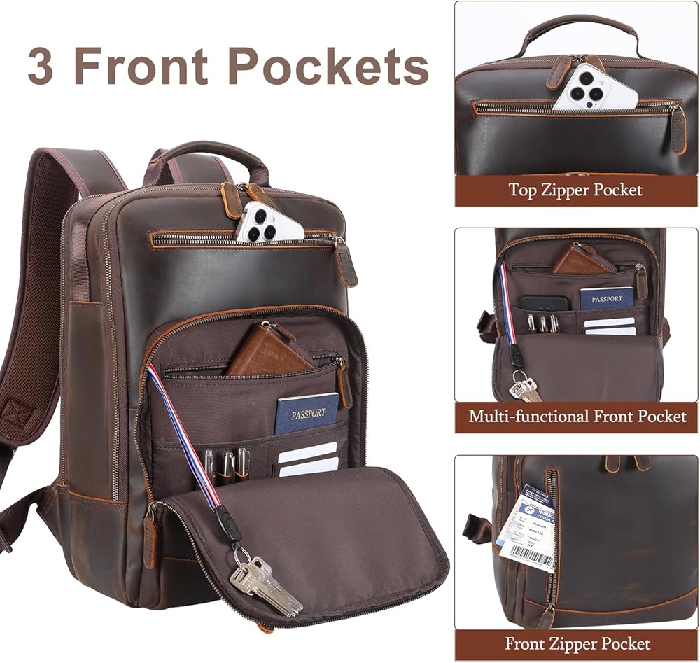 • 【جودة ممتازة】حقيبة الظهر الجلدية للرجال هذه مصنوعة يدويًا من جلد البقر المحبب بالكامل بسمك 1.8 مم مع أجزاء صلبة موثوقة، وبطانة مقاومة للتمزق وسحابات معدنية Ykk - تضمن جودة تدوم طويلاً لسنوات قادمة.