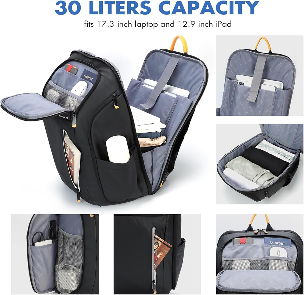 حقيبة ظهر للأعمال للرجال - حقيبة ظهر مقاومة للماء تناسب الكمبيوتر المحمول مقاس 17.3 بوصة، حقيبة ظهر للسفر من النايلون 900D مع منفذ شحن USB وجيب مضاد للسرقة، حقيبة ظهر ذكية سوداء سعة 30 لترًا