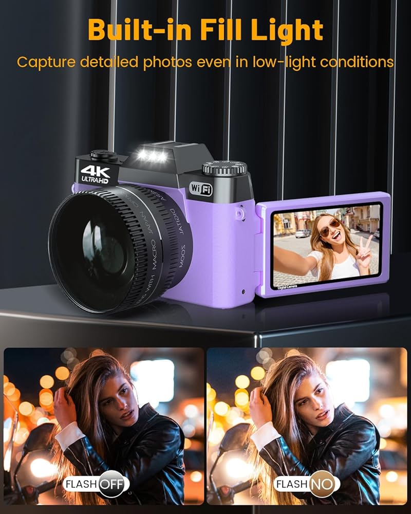 2024 ترقية كاميرا VJIANGER الرقمية للتصوير الفوتوغرافي بدقة 4K بدقة 48 ميجابكسل لليوتيوب مع شبكة WiFi، وشاشة قلاب 180 درجة، وتكبير رقمي 16X، وعدسة 52 مم، وبطاريتين، وبطاقة TF سعة 32 جيجابايت (W02-Purple35)