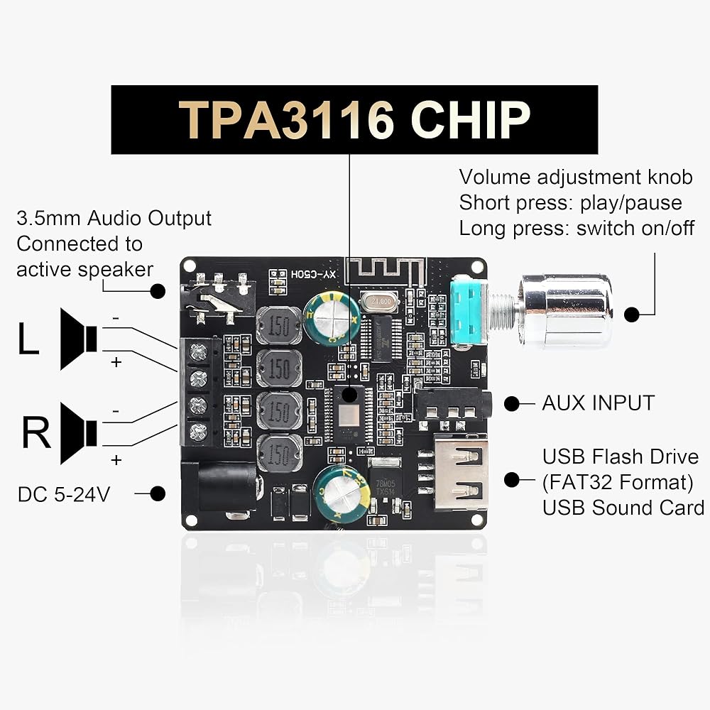 【رقاقة HIFI TPA3116】تعتمد لوحة مضخم الطاقة بلوتوث هذه شريحة TPA3116: إخراج ستيريو ثنائي القناة، طاقة ذروة تصل إلى 50 وات+50 وات. مدخل جهد واسع تيار مستمر: 5-24 فولت.