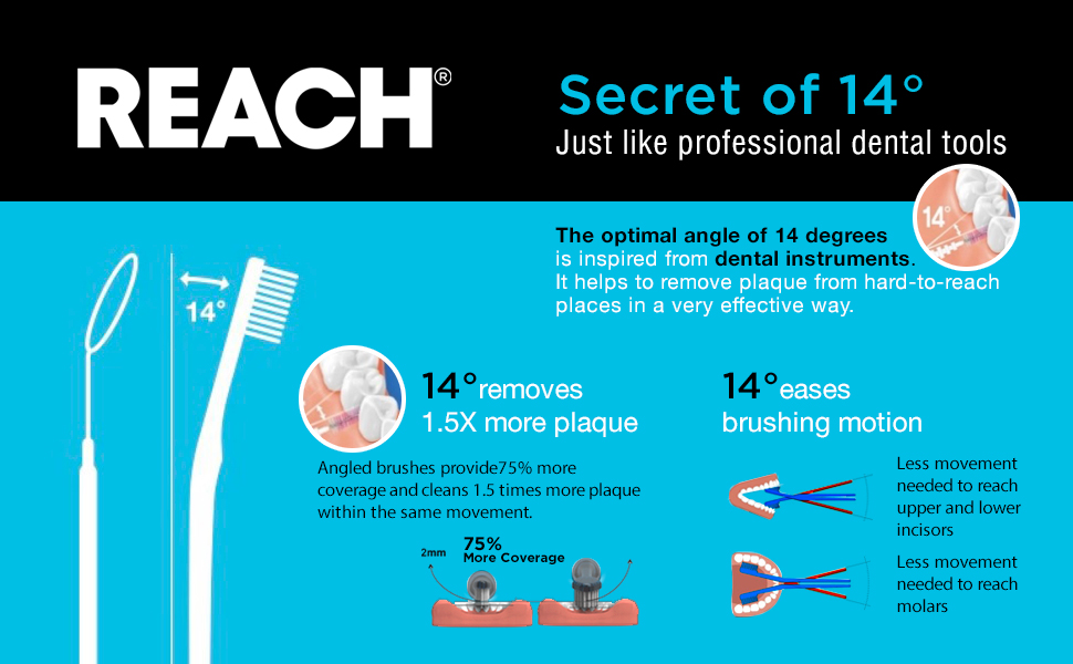 • حركة أسهل للفرشاة: تساعد درجة 14 درجة على إزالة البلاك من الأماكن التي يصعب الوصول إليها بطريقة فعالة للغاية. 14 درجة تسهل حركة تنظيف الأسنان بالفرشاة حيث أن هناك حاجة إلى حركة أقل للوصول إلى القواطع العلوية والسفلية وكذلك الأضراس