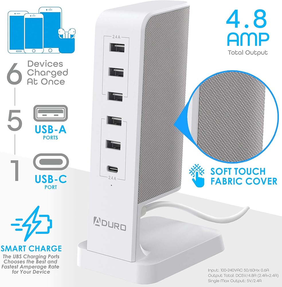 تتيح 6 منافذ USB ذكية (إجمالي الإخراج 4.8) الشحن المتزامن لستة أجهزة متعطشة للطاقة دون البحث عن المنافذ المتاحة، وهي أكثر ملاءمة لك ولعائلتك للشحن في وقت واحد باستخدام تقنية الشحن الذكي