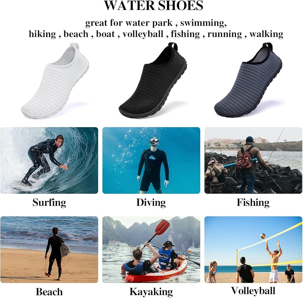 تصميم مريح: تتميز أحذية ركوب الأمواج هذه بأنها خفيفة الوزن وقابلة للانضغاط، وقد تم تصميم هذه الأحذية المائية بأفواه مرنة، والتي ليس من السهل أن تسقط عند ممارسة التمارين كما أنها سهلة الارتداء والخلع مما يجعلها أسهل في حملها أثناء التنزه سيرًا على الأقدام.