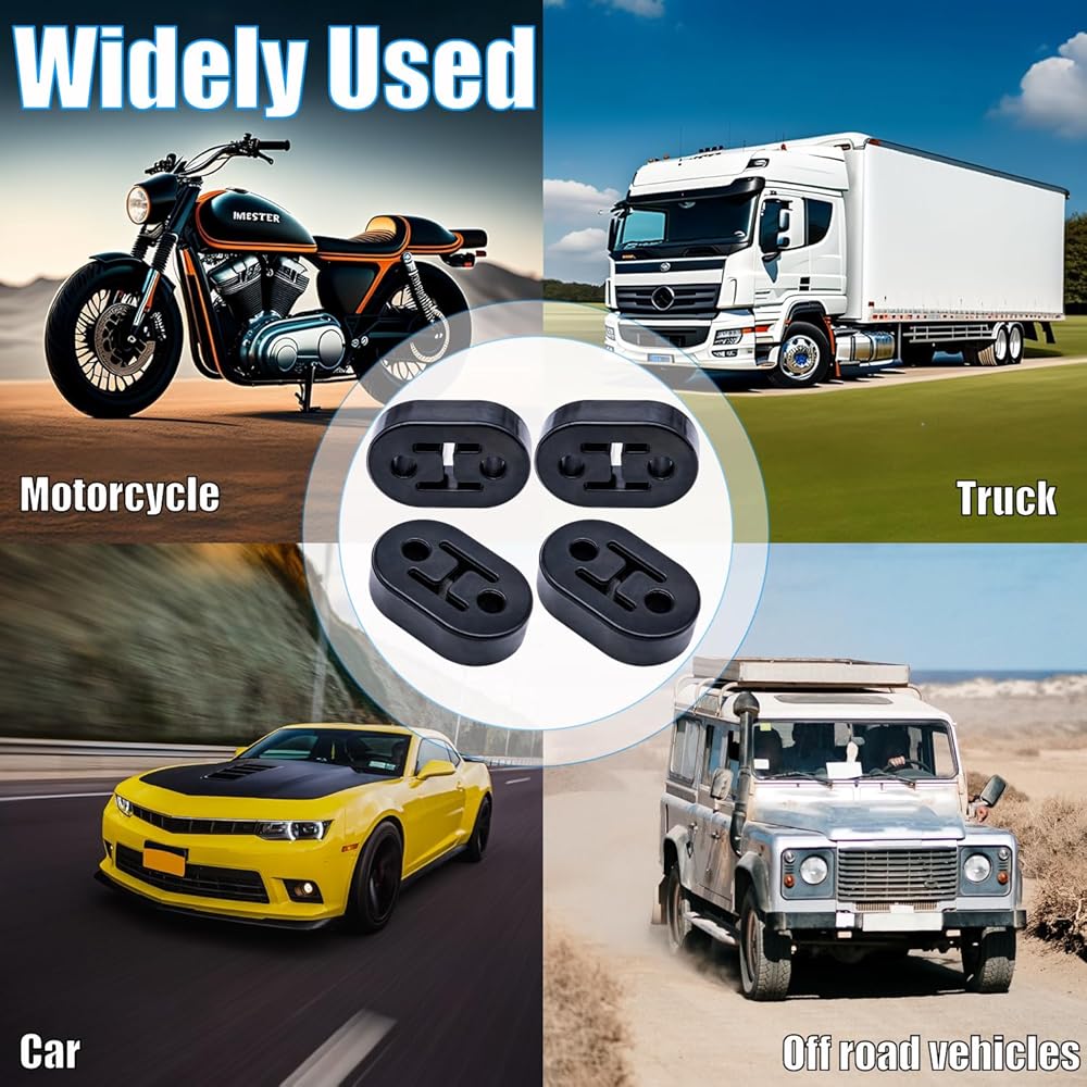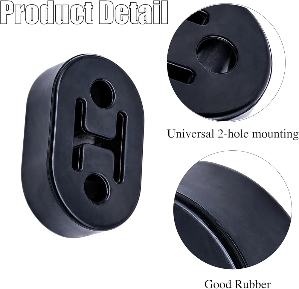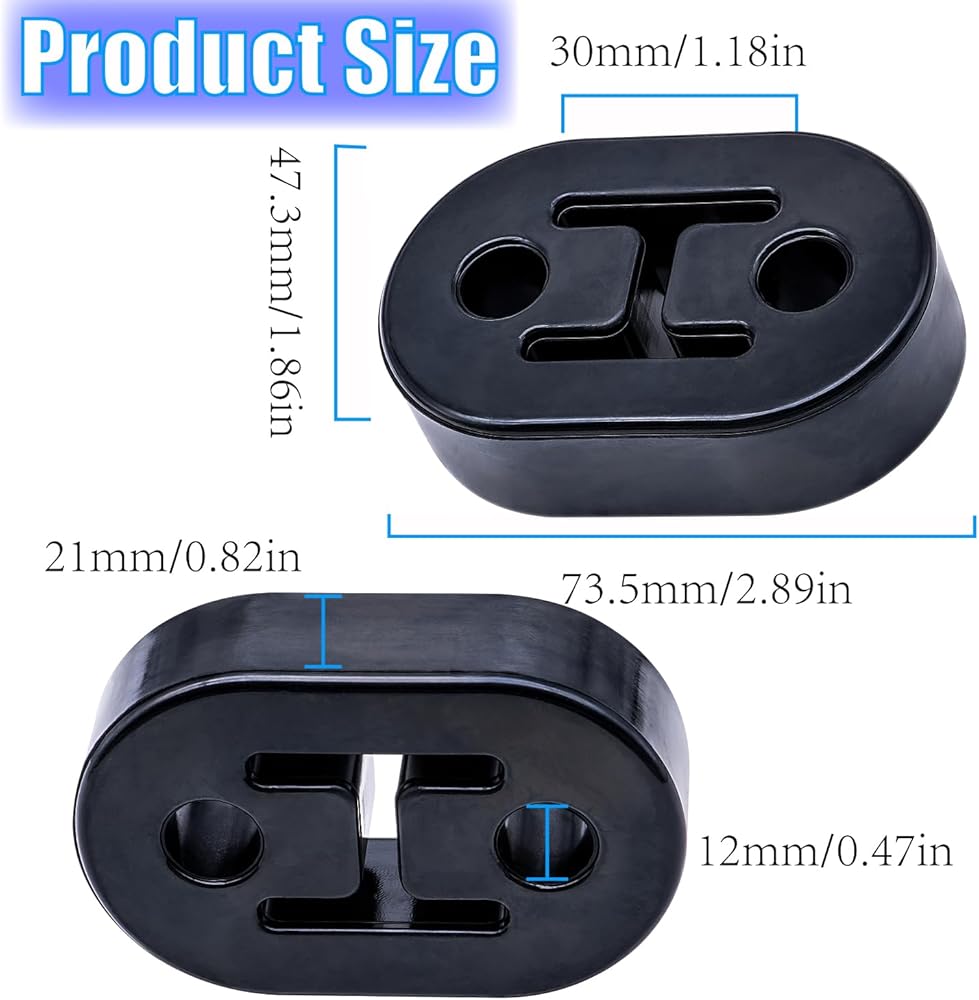 الأبعاد: مجموعة 4 قطع من شماعات العادم، الطول 7.875 بوصة (73 ملم). العرض 1.85 بوصة (47 ملم). الارتفاع 0.81 بوصة (20.8 مللي متر). قطر الثقب الداخلي 0.47 بوصة (12 مللي متر). تأمين العادم بشكل أفضل وتقليل الاهتزاز. تركيب عالمي بفتحتين.