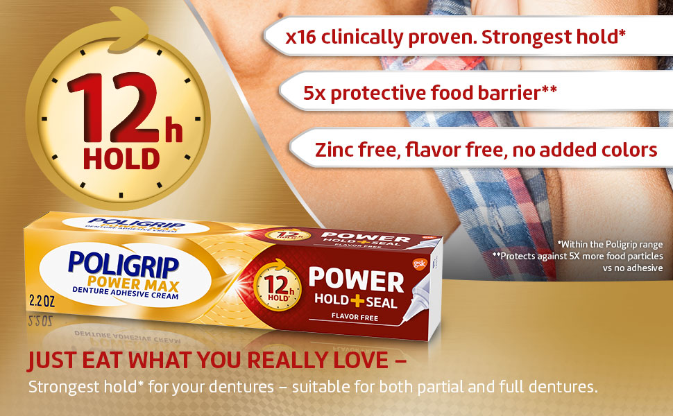 كريم لاصق باور ماكس باور هولد + سيل من بوليجريب يمنح أطقم الأسنان أقوى ثبات طوال اليوم مع 5 أضعاف سدادة الطعام الواقية (1، 2). حتى أطقم الأسنان الملائمة بشكل جيد عرضة لجزيئات الطعام التي يمكن أن تسبب عدم الراحة وتهيج اللثة. كريم لاصق لطقم الأسنان من بوليغريب مثبت سريريًا × 16 ويوفر أقوى ثبات (2) ويتميز بفوهة دقيقة تمكن كريم الأسنان من توفير ختم شامل للمساعدة في منع الطعام من الالتصاق تحت أطقم الأسنان. تم تركيب لاصق طقم الأسنان هذا ليكون خاليًا من النكهات. حجم الأنبوب الأصغر مثالي لوضعه في حقيبة السفر أو محفظتك لمنتجات طقم الأسنان أثناء التنقل. ما عليك سوى وضع كمية صغيرة من لاصق الأسنان على أطقم الأسنان النظيفة والجافة والملائمة جيدًا مرة واحدة يوميًا كجزء من روتين العناية بالأسنان لمدة 12 ساعة. يخلق لاصق باور ماكس للأسنان من بوليجريب طبقة بين أطقم الأسنان واللثة لملاءمة مريحة وثبات قوي طوال اليوم، مما يسمح لك بتناول الطعام والتحدث والابتسام بثقة. (1) مقابل عدم وجود لاصق (2) ضمن نطاق بوليجريب