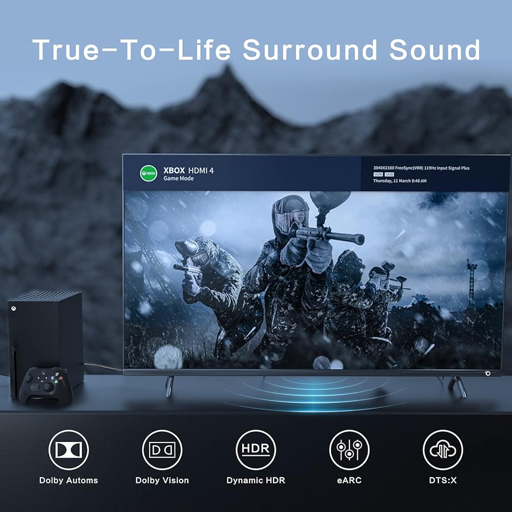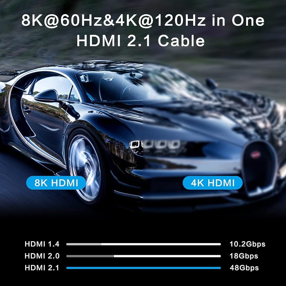 【4K@120 هرتز للألعاب】 بالمقارنة مع HDMI 2.0، فقد قفزت سرعة النقل الخاصة بها قفزة نوعية من 18 جيجابايت في الثانية مباشرة إلى 48 جيجابايت في الثانية (6 جيجابايت/ثانية). مع تقنية HDR الديناميكية الفريدة من نوعها 8K HDMI وتقنية معالجة الألوان 12 بت وعرض النطاق الترددي 48 جيجابايت في الثانية، فإنها توفر تجربة أفلام فائقة الدقة وتأثيرات بصرية ثلاثية الأبعاد، كما أنها تتيح صورًا فائقة السلاسة بدقة 4K@120HZ. يعمل معدل التحديث المتغير والتبديل السريع للوسائط على تقليل زمن الوصول وضبابية الحركة وتمزيق الإطار من أجل ألعاب أكثر سلاسة وخالية من التأخر وواقع افتراضي تفاعلي في الوقت الفعلي.