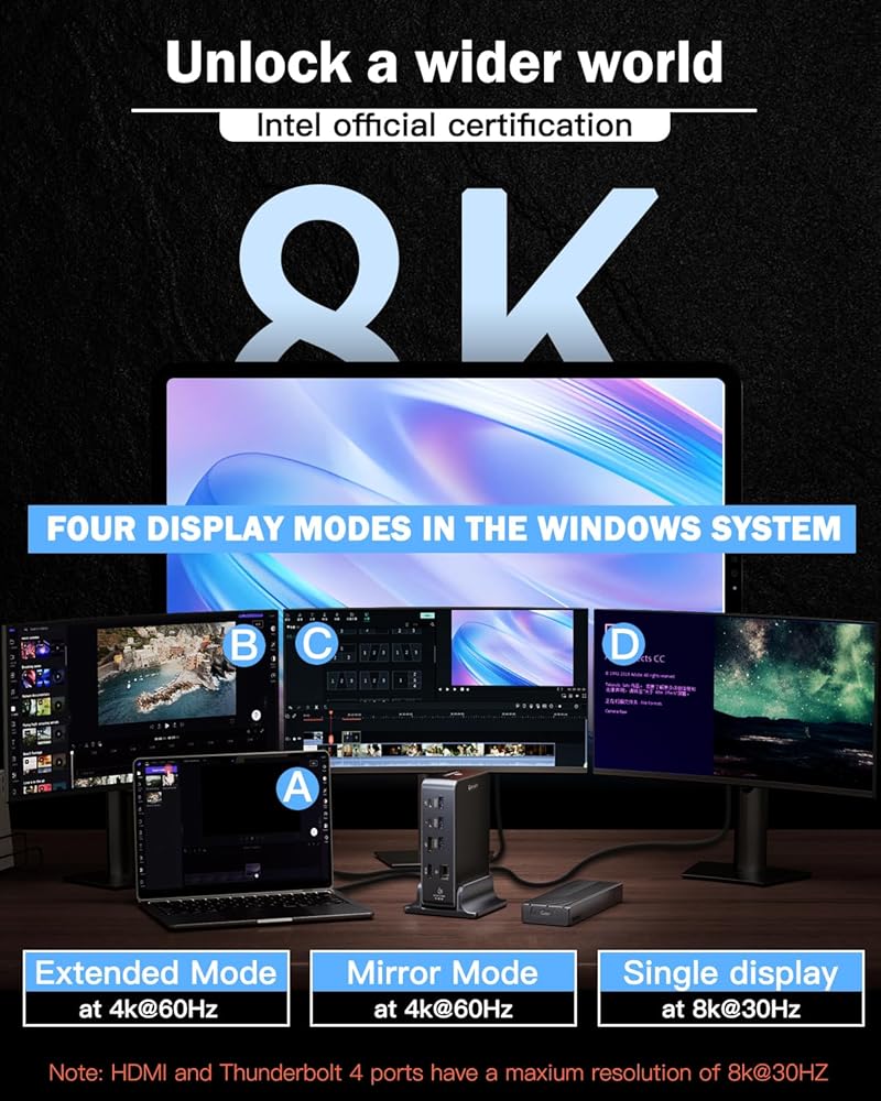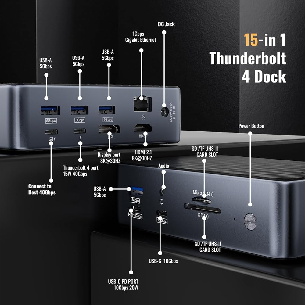 قاعدة Thunderbolt 4 (معتمدة من Intel)، محطة إرساء MacBook Pro مع 15 في 1، طاقة 160 واط، 8K@30 هرتز أو 4K@60 هرتز، Thunderbolt Hub لأجهزة الكمبيوتر المحمولة التي تعمل بنظام Windows وMacBook PC. USB-C، USB-A، إيثرنت، الصوت، SD4.0