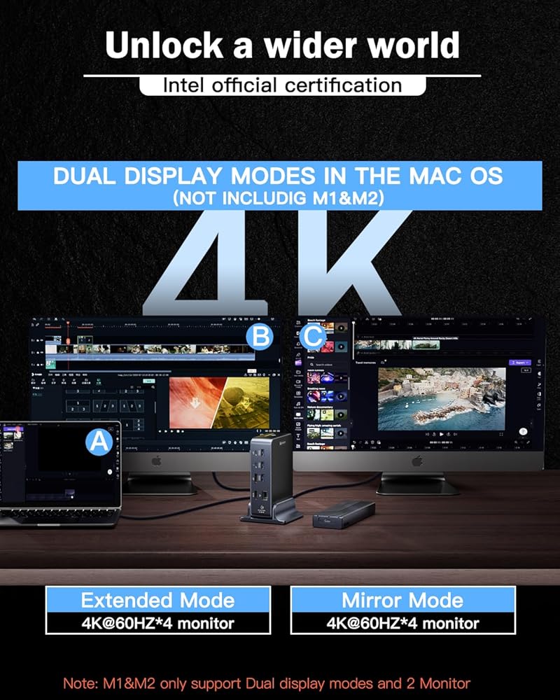 • ملاحظة مهمة لمستخدمي نظام التشغيل Mac: يدعم نظام macOS فقط الشاشات المزدوجة بدقة 4K بمعدل 60 هرتز على أجهزة Intel أو M1/M2/M3 Pro أو M1/M2/M3 Max MacBook Pro أو Mac Mini بينما يدعم شاشة واحدة بدقة 4K بمعدل 60 هرتز على MacBook Pro أو Mac Mini مع رقائق M1 أو M2 أو M3 الأساسية. إذا كان لدى DisplayPort وHDMI إخراج فيديو في وقت واحد، فإن منفذ الإخراج (منفذ Thunderbolt) لا يدعم إخراج الفيديو ويقتصر على إخراج بيانات بسعة 5 جيجابايت.