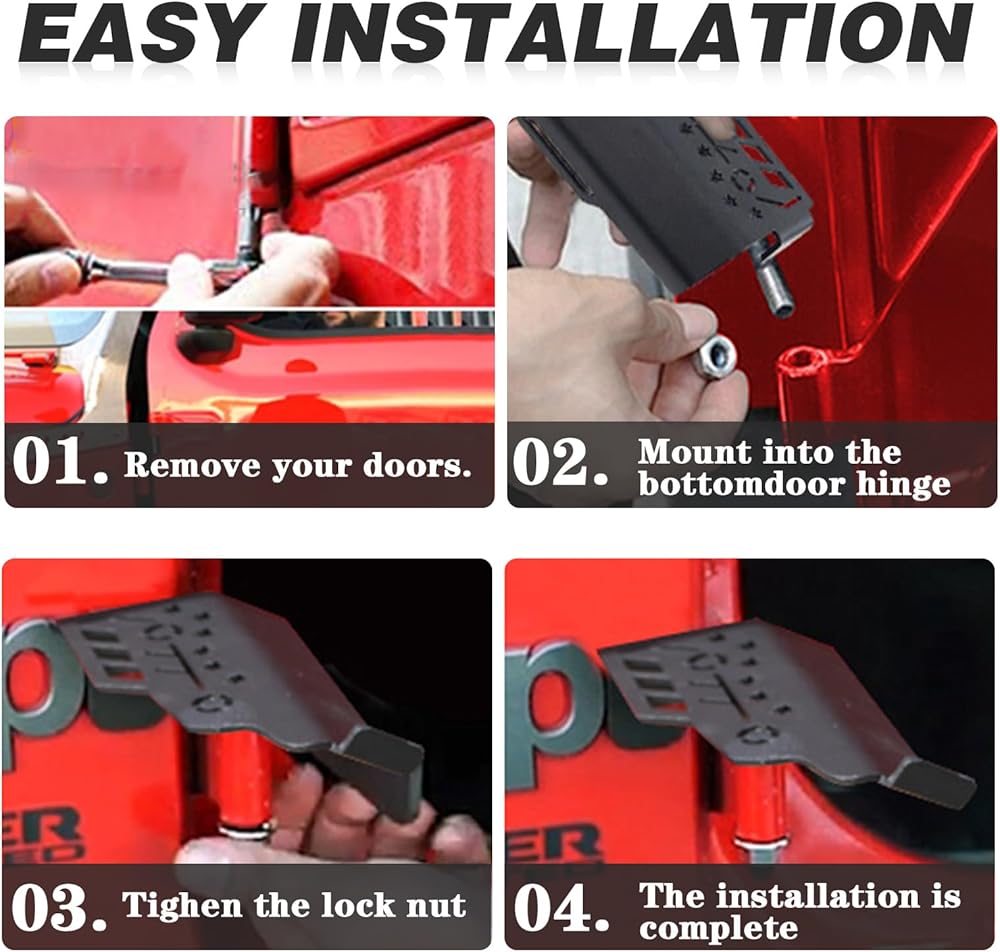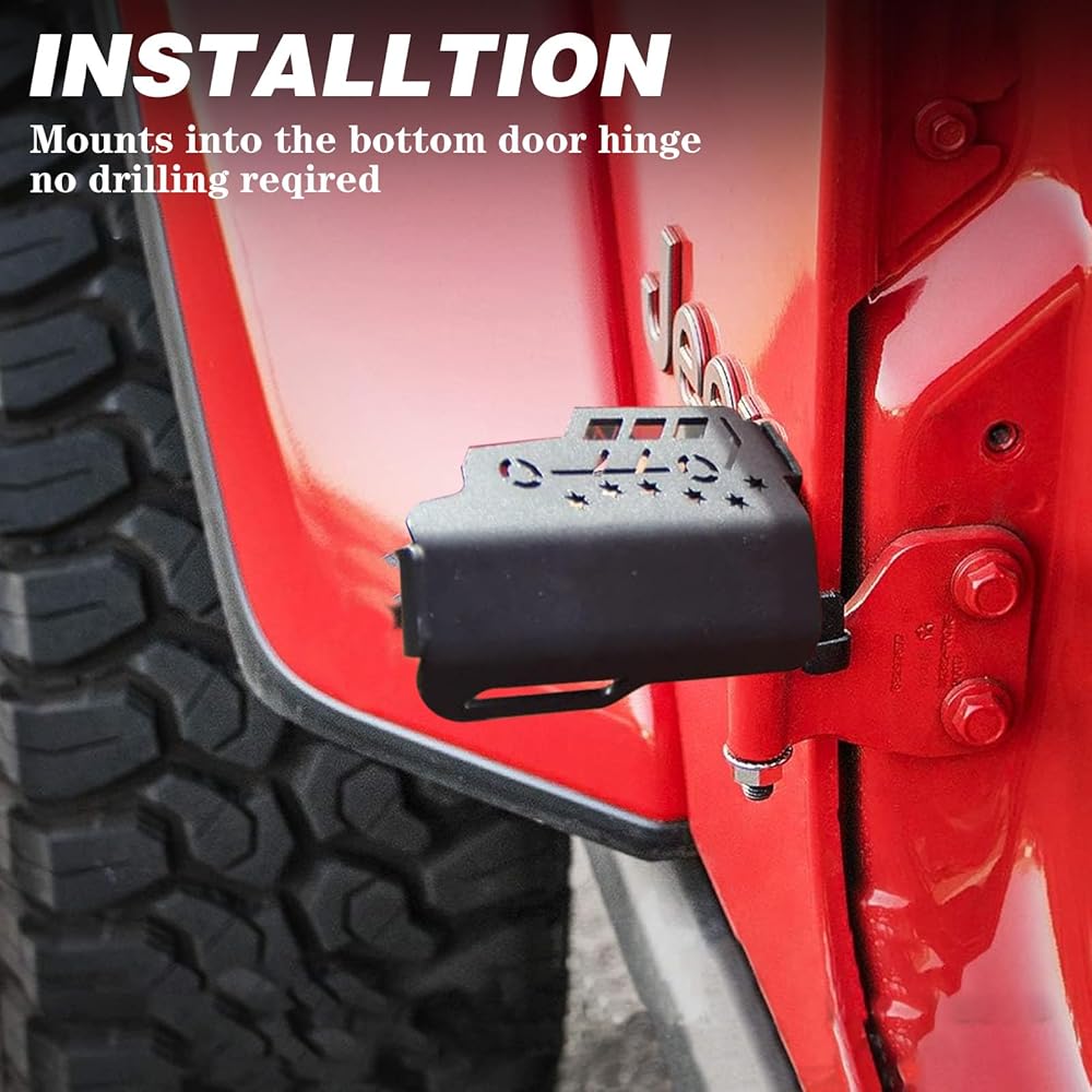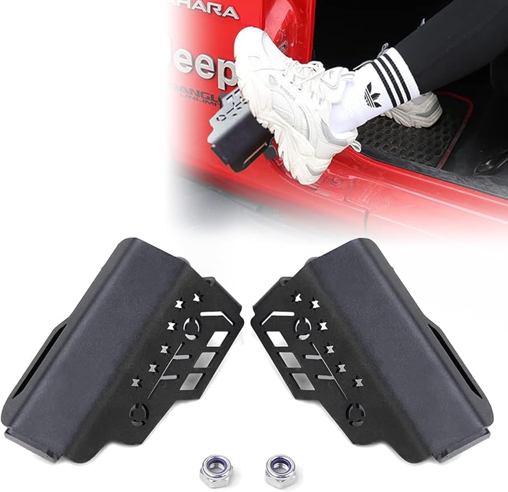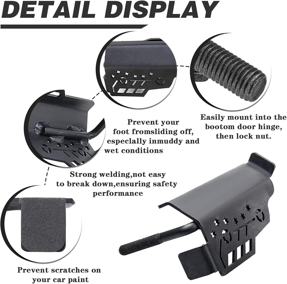 تتضمن العبوة: 2 * أوتاد قدم + 2 * صواميل لولبية، سهلة التركيب، فقط قم بتركيبها على مفصل الباب السفلي لسيارة الجيب وشد الصواميل.