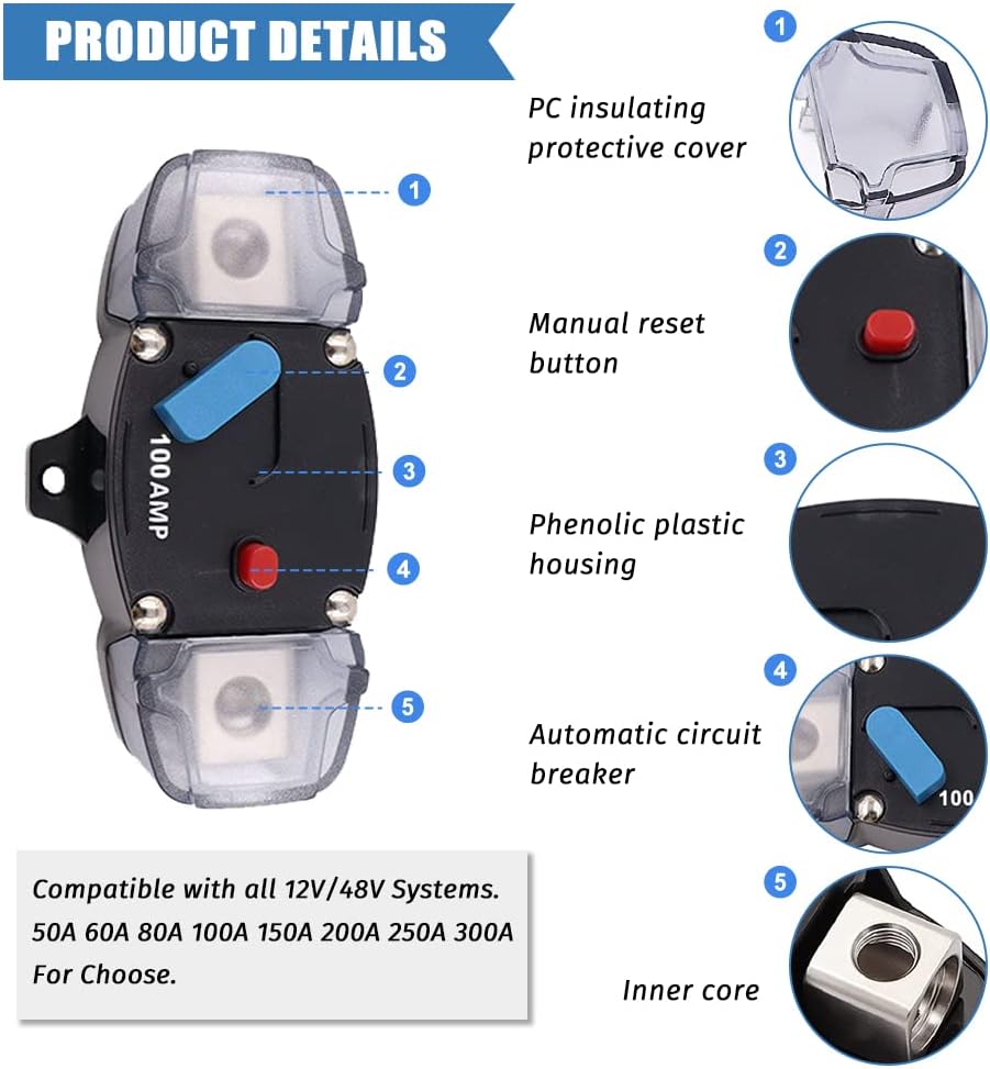 مقياس السلك: قاطع دائرة KEDAKEJI 300 أمبير يقبل سلك الطاقة بمواصفات 0/2/4/8، مع محول، ومدخل الأسلاك (BAT)، ومخرج (AUX). التثبيت على اللوحة أو جدار الحماية. العملية بسيطة ومريحة.