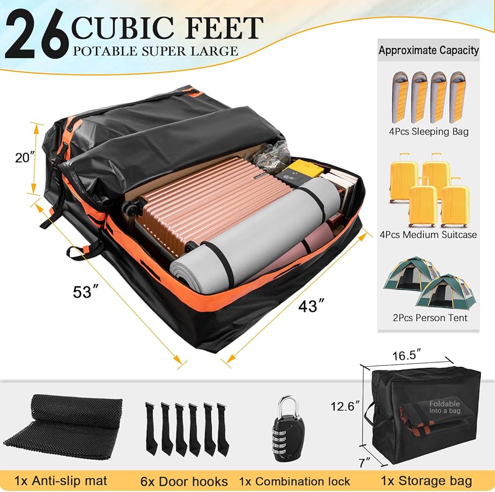 ✅ سعة كبيرة 26 قدمًا مكعبًا: توفر حاملة البضائع على السطح التي تبلغ 26 قدمًا مكعبًا (53 بوصة × 43 بوصة × 20 ارتفاعًا) مساحة تخزين واسعة، وحقيبة حمل البضائع على سطح السيارة تسمح لك بسهولة تخزين الأمتعة ومعدات التخييم والمعدات الرياضية ، و اكثر. قل وداعًا لمتاعب مساحة التخزين المحدودة، سواء كنت في رحلة طويلة أو تمارس أنشطة خارجية.