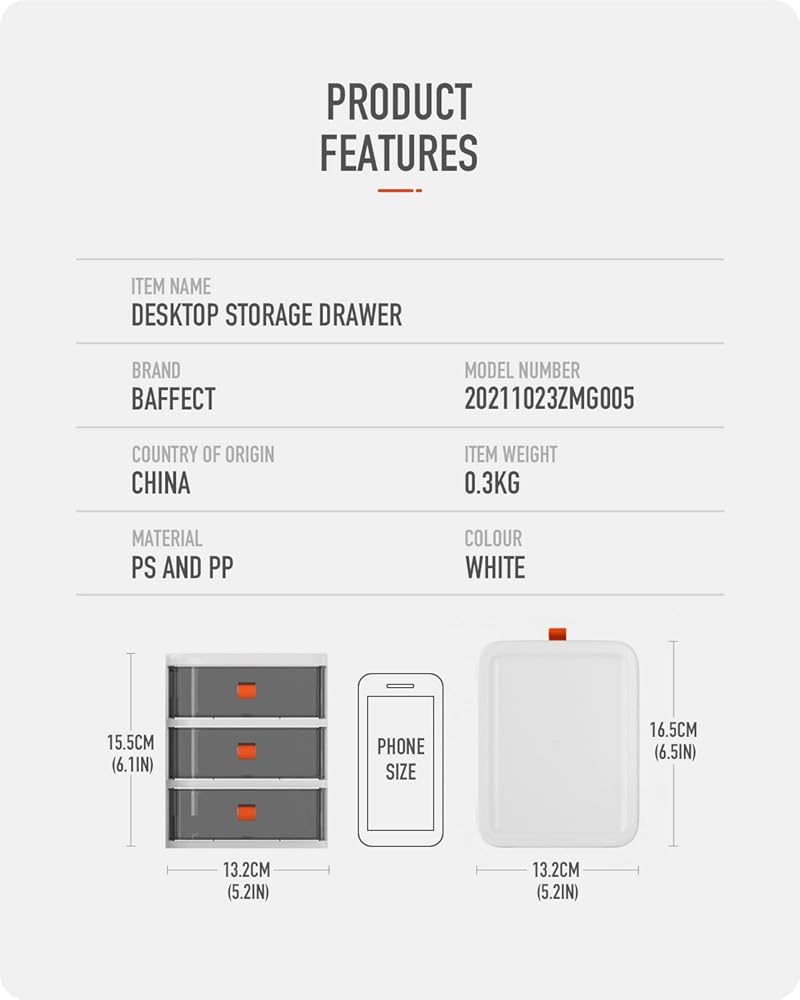 قوي ومتين - صندوق تخزين سطح المكتب Baffect مصنوع من مواد PS وPP عالية الجودة من أجل المتانة والمتانة. بفضل هيكله الصلب، يتميز منظم الأدراج هذا بقدرة تحمل عالية. بالإضافة إلى ذلك، فإن القاعدة المعززة لمنظم الأدراج البلاستيكي هذا تجعله ثابتًا دون أن ينقلب بسهولة.