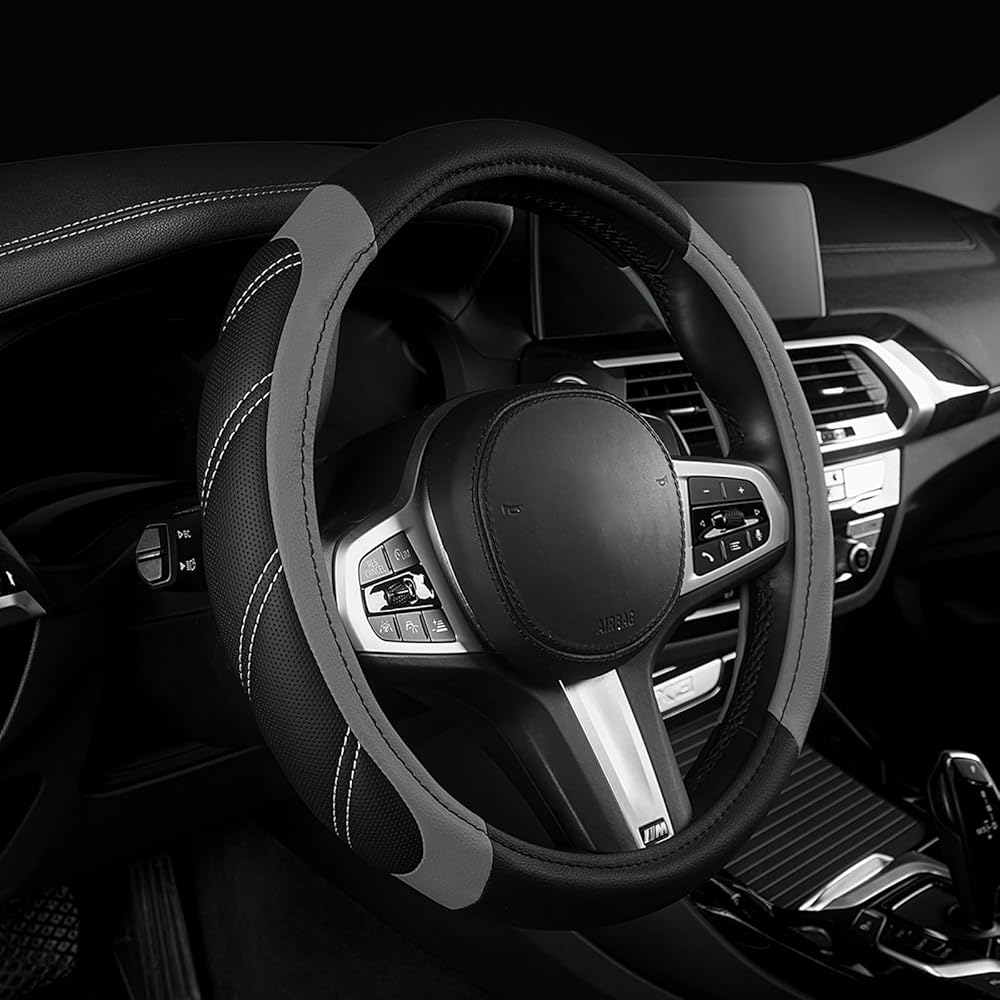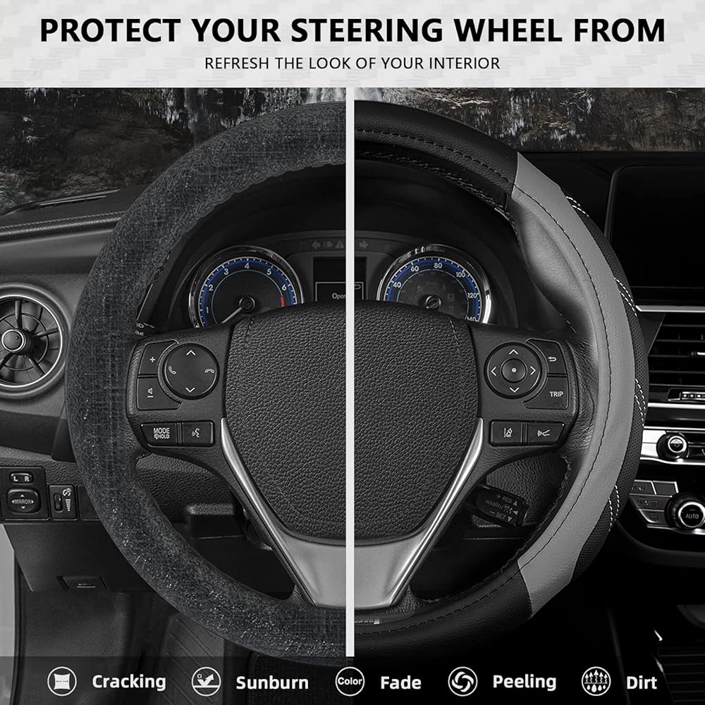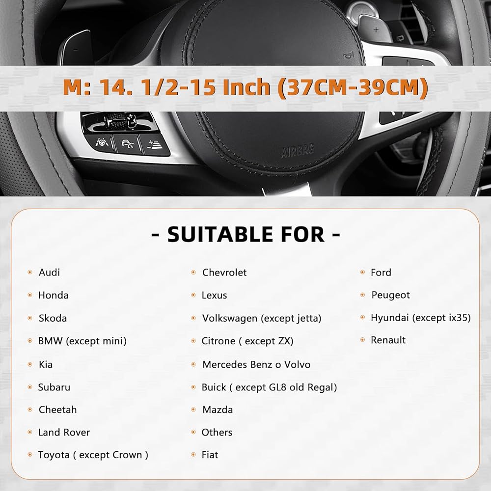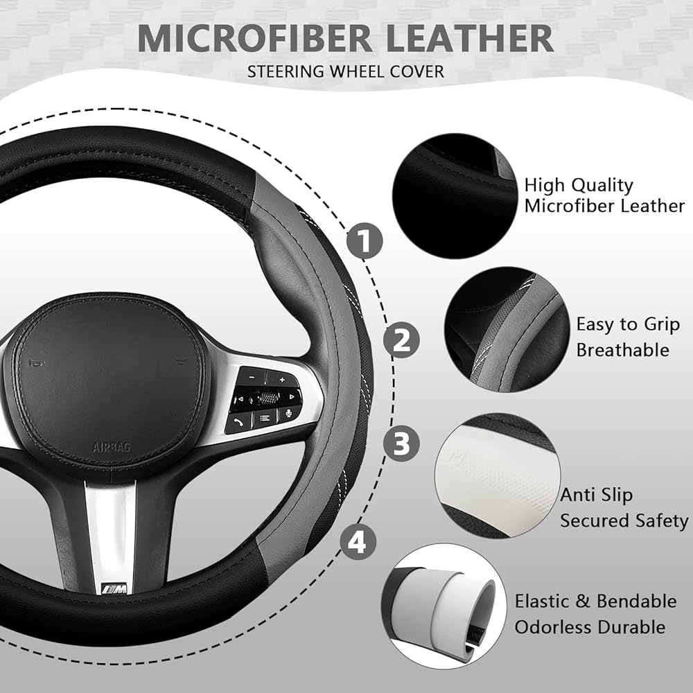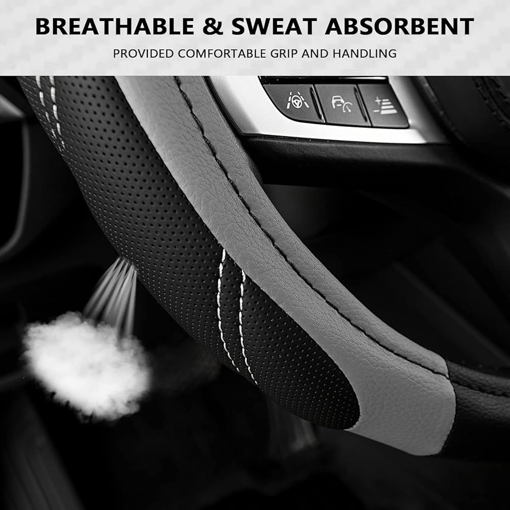 قابلة للكسر وممتصة للعرق: فتحات غير قابلة للانزلاق على سطح واقي عجلة السيارة تسمح لك بالإمساك بعجلة القيادة بشكل أفضل وتوفر لمسة مريحة عند القيادة. جلد من الألياف الدقيقة المسامية يحافظ على راحة يدك بعيدًا عن العرق اليدوي، كما يمنحك ملمسًا مريحًا ودافئًا في الشتاء وباردًا في الصيف. مقاوم للعرق، ومضاد للانزلاق، ومستقر.