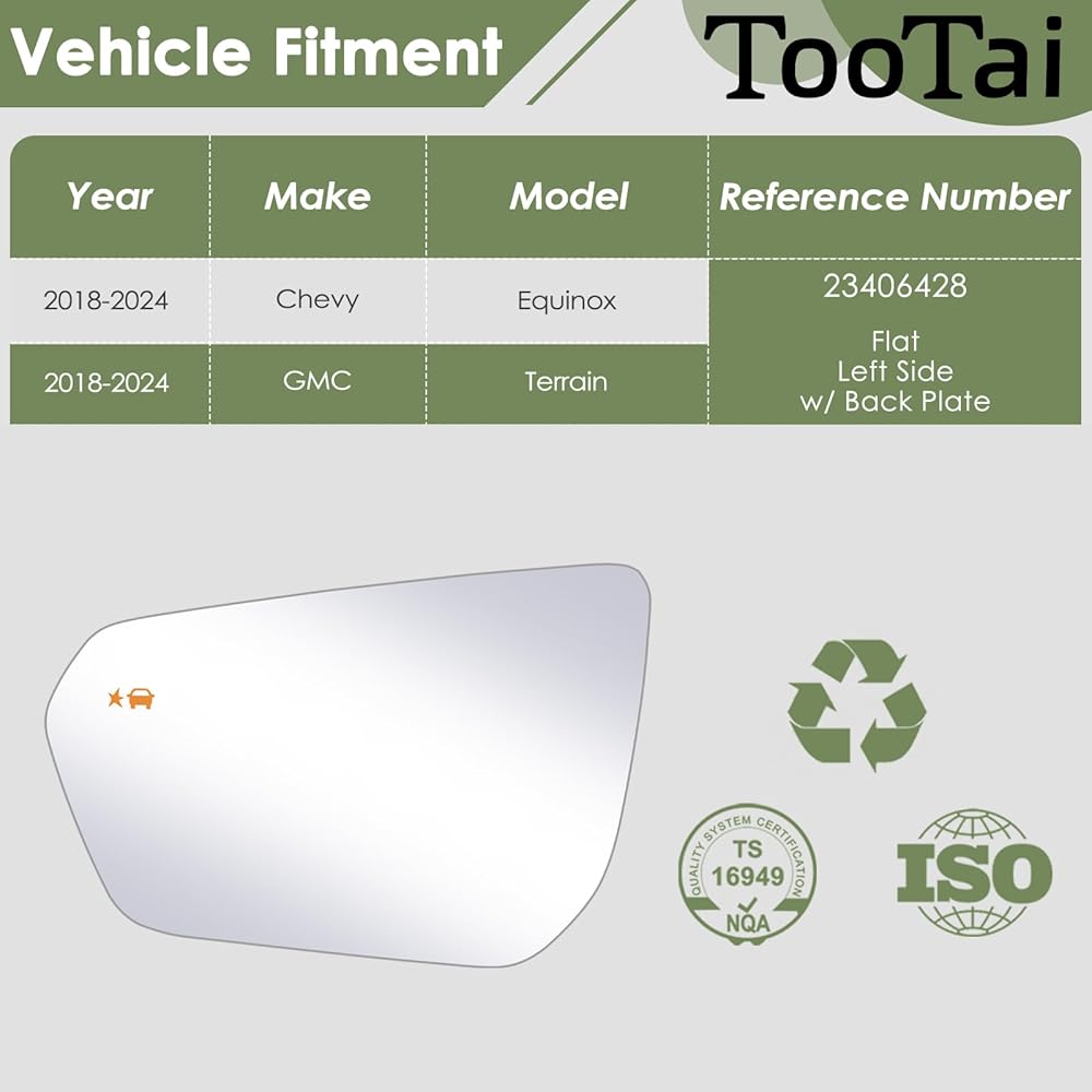 زجاج مرآة بديل لجانب السائق - متوافق مع مركبات Chevy & GMC - Equinox 2018-2024، Terrain 2018-2024 - مُسخن مع اكتشاف البقع العمياء، بدون تعتيم تلقائي، LH