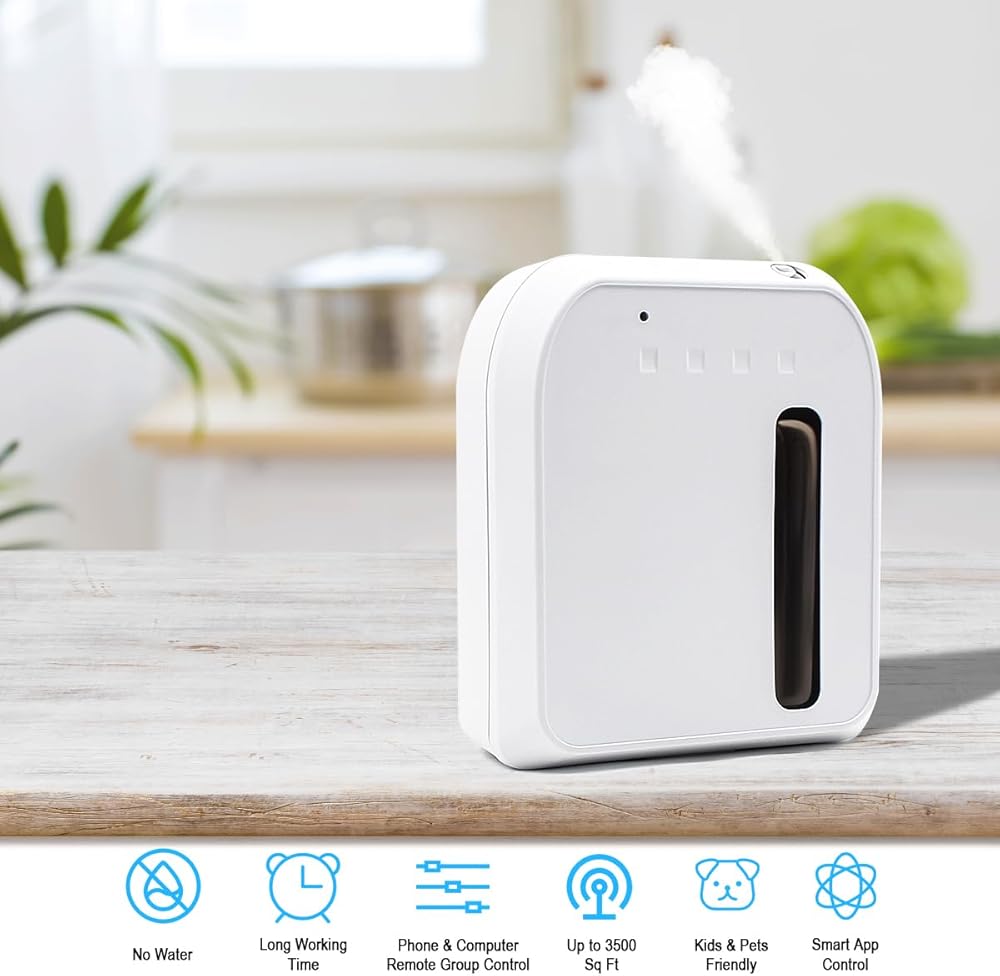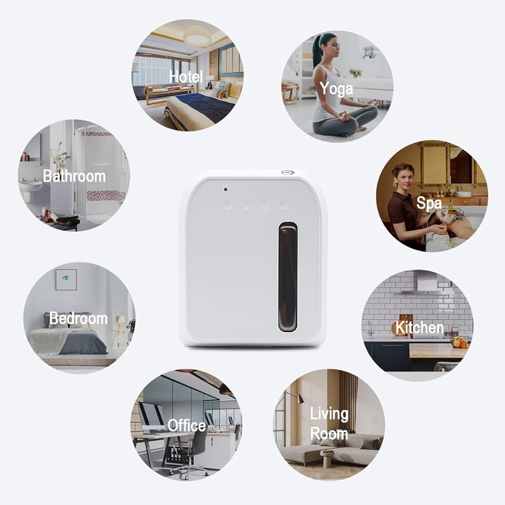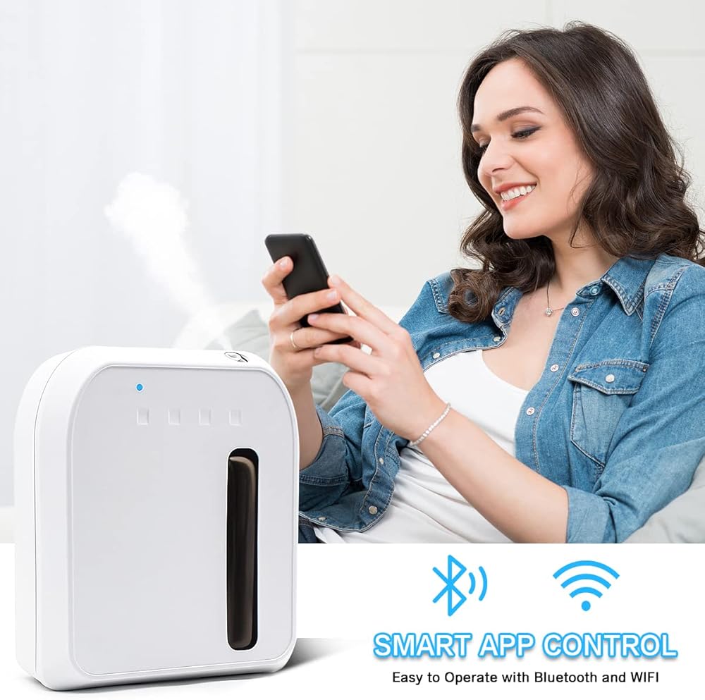 التحكم الذكي في التطبيق: من السهل جدًا التحكم في ماكينة هواء الرائحة للمنزل عبر البلوتوث أو الواي فاي. قم بتنزيل التطبيق وتوصيل آلة هواء الرائحة، واضبط وقت العمل ودرجة الرائحة، ويمكنك بسهولة التحكم في آلة هواء الرائحة الذكية باستخدام تطبيق الهاتف الذكي من أي مكان وفي أي وقت. أكثر ذكاءً وملاءمة من موزع الزيوت العطرية العادي.
