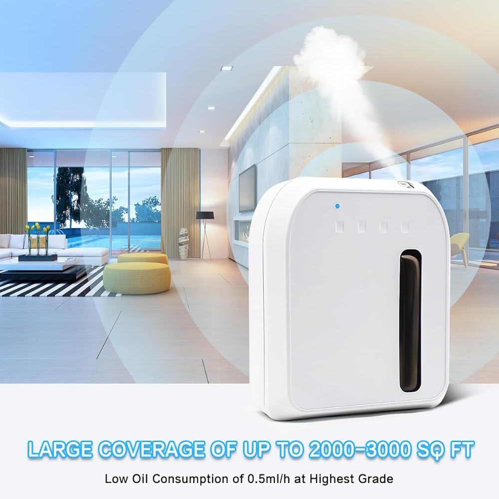سعة كبيرة وتغطية: تتميز ماكينة الهواء العطرية هذه بحجم أصغر وفي الوقت نفسه تحتوي على زجاجة زيت عطري أكبر بسعة تصل إلى 800 مل، مما يجعلها قادرة على العمل لمدة تصل إلى 2-3 أشهر في معظم الحالات. مزود بمضخة هواء قوية ومروحة بالداخل، يمكن للناشر أن يغطي مساحة تصل إلى 2000-3000 قدم مربع، مما يجعله مثاليًا لخلق أجواء رائعة ومريحة لغرف النوم أو الحمامات أو غرفة المكتب أو غرفة السبا أو بعض المساحات التجارية.