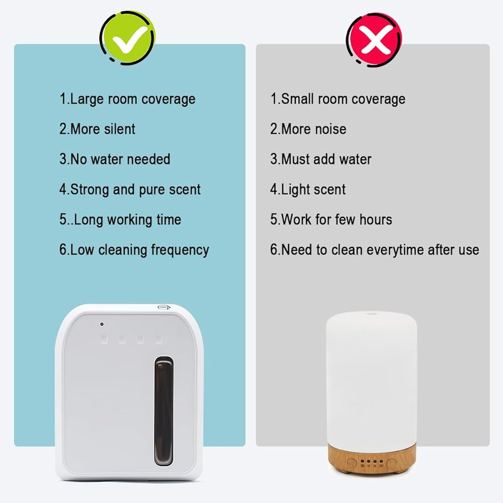 أحدث تكنولوجيا لتوزيع الهواء البارد: يختلف عن موزع الروائح العطرية العادي غير الصوتي الموجود في السوق، يعتمد موزع الروائح العلاجية الخاص بنا على أحدث تكنولوجيا لنشر الهواء البارد، والتي يمكنها ضغط الهواء البارد لتحويل الزيت العطري إلى جزيئات دقيقة للرذاذ الجاف مع معدل استخدام عالٍ، ورائحة متساوية في أي بيئة. في دقائق، لا تترك أي بقايا ولا حاجة إلى الماء، فلا داعي للقلق من تنظيفها بشكل متكرر.