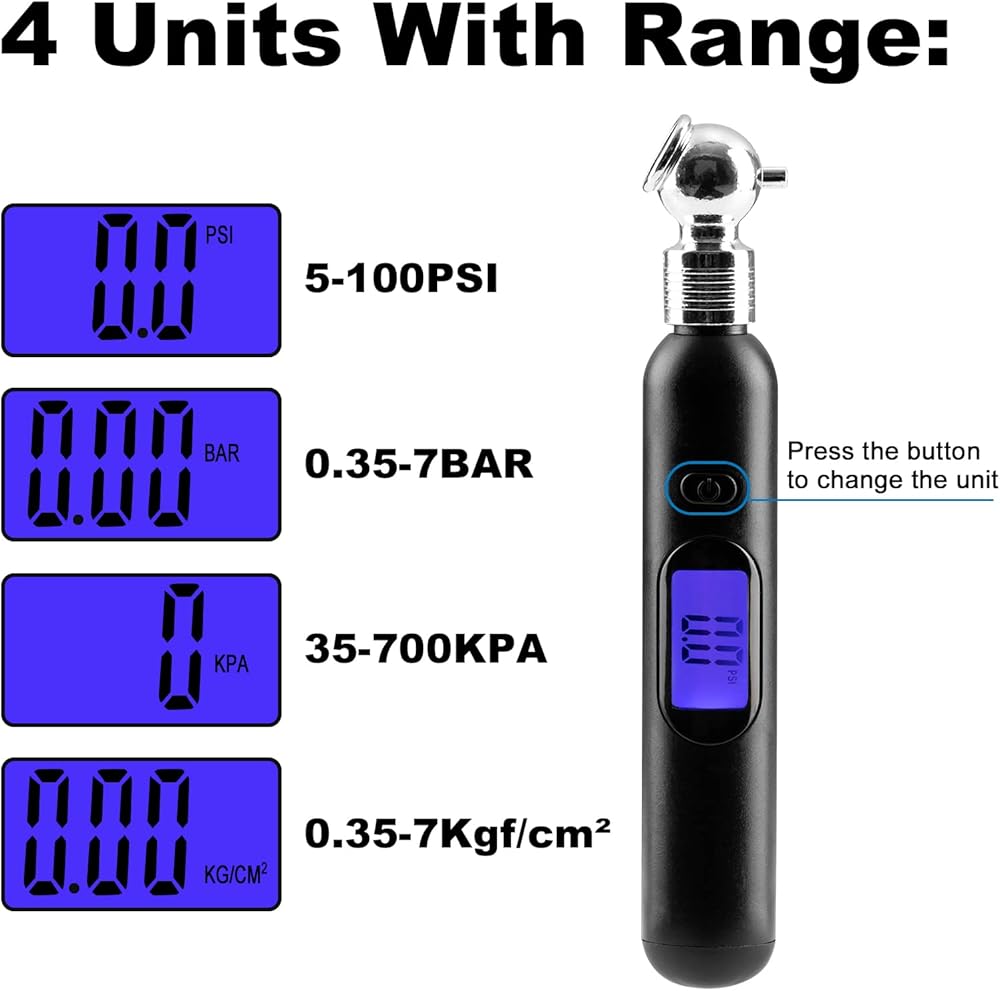 مقياس ضغط الإطارات الرقمي من CZC AUTO، 4 إعدادات لفحص الضغط الصغير حتى 100 رطل لكل بوصة مربعة (7 بار)، شاشة LCD بإضاءة خلفية وأداة على شكل قلم رصاص للسيارات والدراجات النارية، أسود