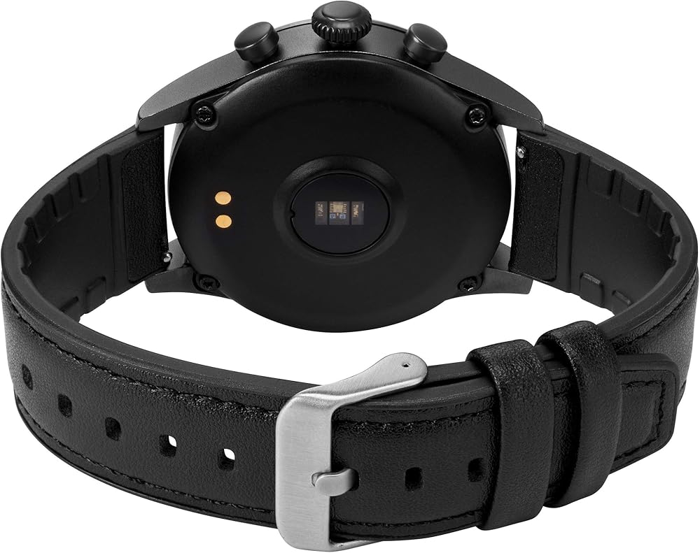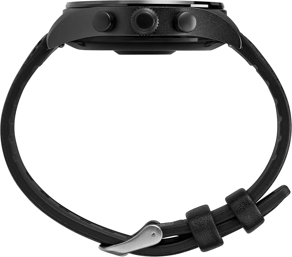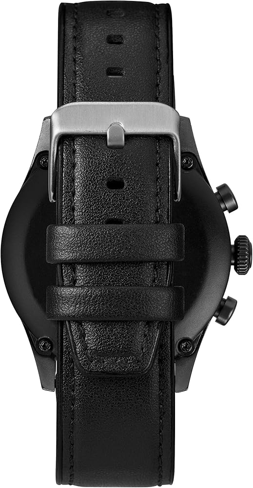حزام من الجلد الأصلي مقاس 22 مم قابل للتعديل يناسب محيط المعصم حتى 8 بوصات؛ هيكل دائري من المعدن الأسود خفيف الوزن مقاس 43 ملم