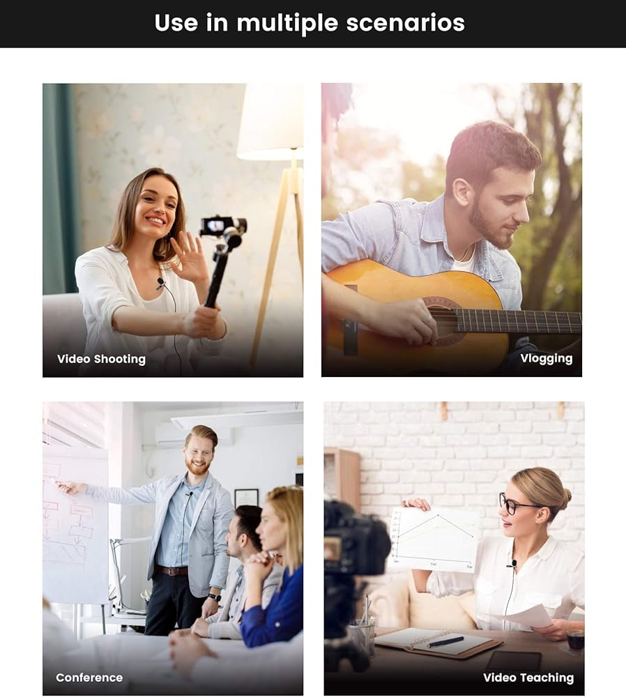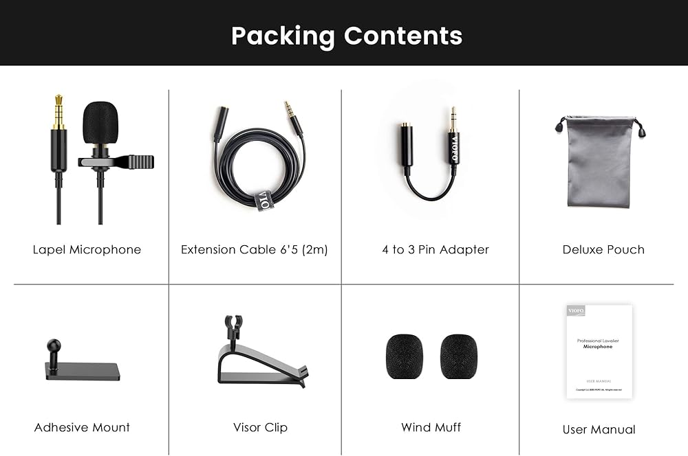تتضمن الحزمة 1x ميكروفون طية صدر السترة، 1x 79 بوصة (2 متر) كابل تمديد، 1x 4 إلى 3 دبابيس محول، 1x مشبك قناع، 1x حامل لاصق، 2x واقي الرياح، 1x حقيبة برباط. يمكن استخدامه بسهولة وسرعة من قبل أي شخص، في أى مكان.