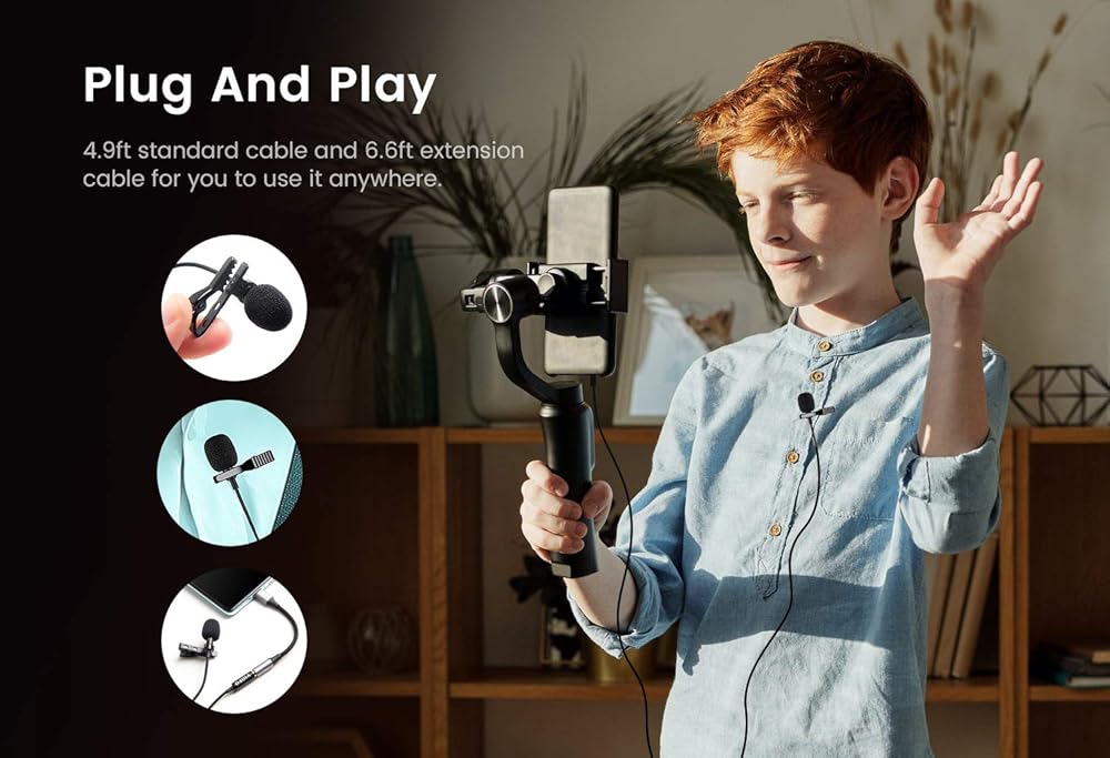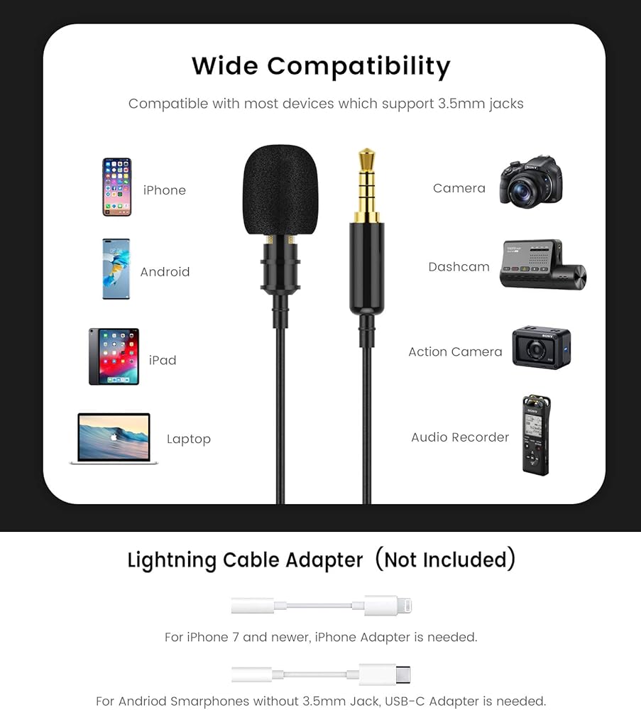 يحتوي الميكروفون على قابس 3.5 ملم ذو 4 أقطاب ومحول قابس ثلاثي الأقطاب إضافي، يستخدم على نطاق واسع في العديد من الهواتف المحمولة وأجهزة الكمبيوتر الشخصية / أجهزة الكمبيوتر المحمولة وكاميرات DSLR ومسجلات الصوت. ملاحظة: لا يتم تضمين محول USB C ومحول iPhone.