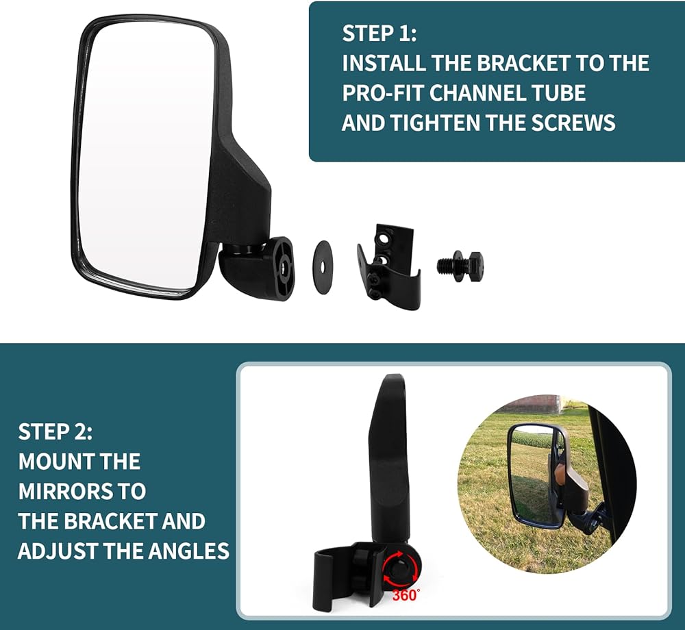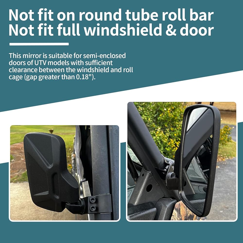 【انتبه】①غير مناسب للأقفاص الأسطوانية! ②هذه المرآة مناسبة للأبواب شبه المغلقة من طرازات UTV مع خلوص كافٍ بين الزجاج الأمامي وقفص اللف (فجوة أكبر من 0.18 بوصة). ③تتطلب الأبواب المغلقة بالكامل ثقوبًا إضافية في الباب.
