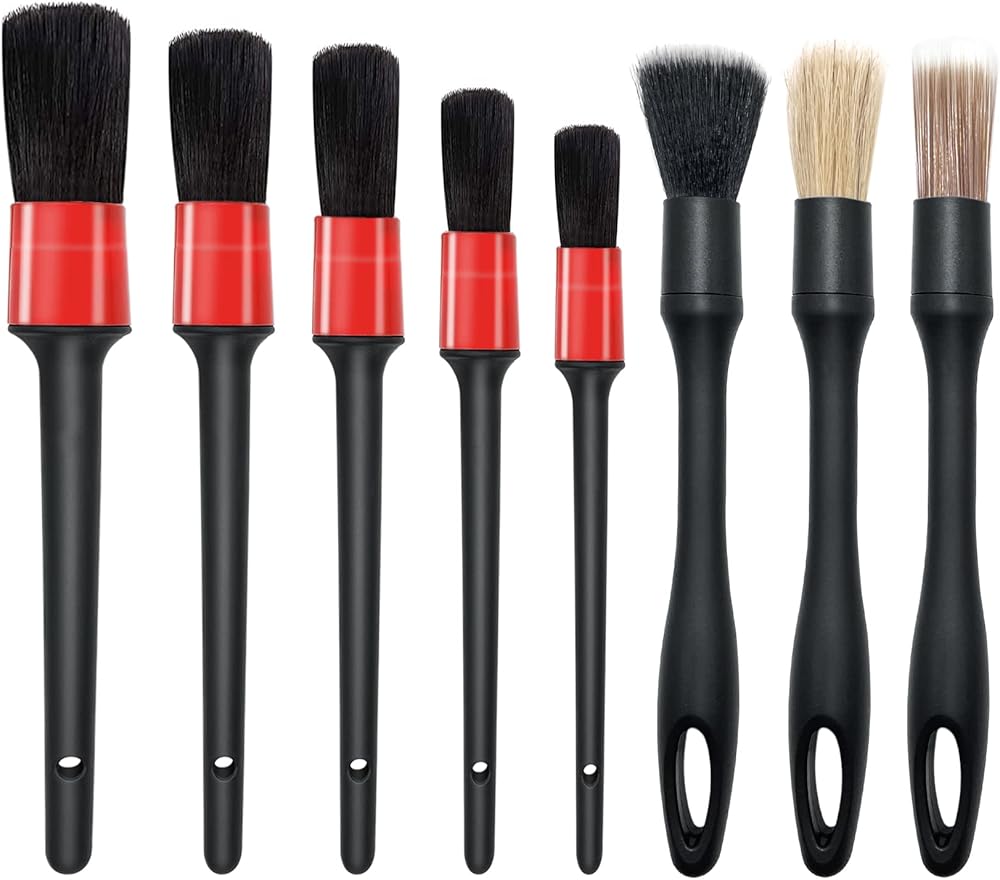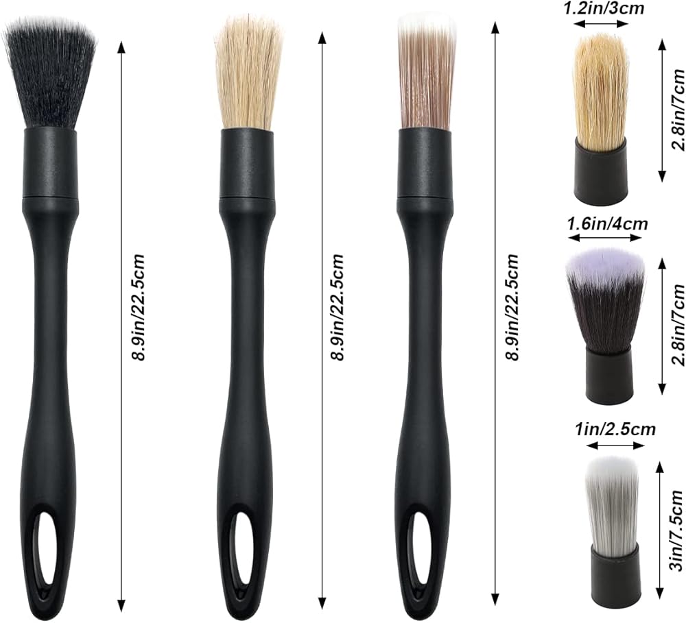 فرشاة تفاصيل السيارة بشعيرات ملونة: 3 فرش تفاصيل تلقائية من مواد مختلفة، مصنوعة من شعر الخنزير النقي بنسبة 100%، شعيرات فائقة النعومة. رأس الفرشاة الخشبية قابلة للاستبدال وإعادة الاستخدام، يمكنك تغيير رأس الفرش حسب احتياجاتك. يمكن استخدامها لتنظيف الجزء الداخلي والخارجي للسيارة، مثل لوحة فتحة تهوية مكيف الهواء وصواميل العروة والعجلات والإطارات وخليج المحرك والمساحة الضيقة أو الصغيرة.