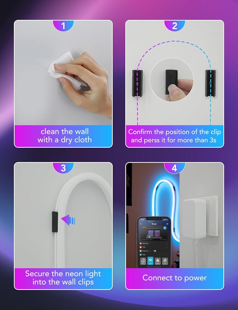 تطبيق واسع: يمكن تطبيق مقاطع ضوء حبل النيون Govee على أي سطح أملس. مثل الجدران والأسقف وبلاط السيراميك. دعامات لجميع موديلات مصابيح حبل النيون Govee، H61D3 وH61D5 (لا تدعم H61A0، H61A1، H61A2، H61A5).