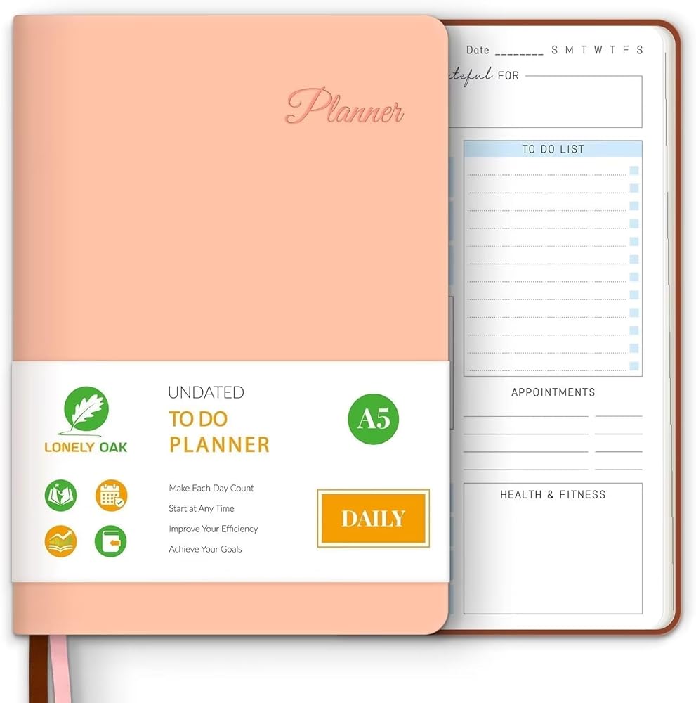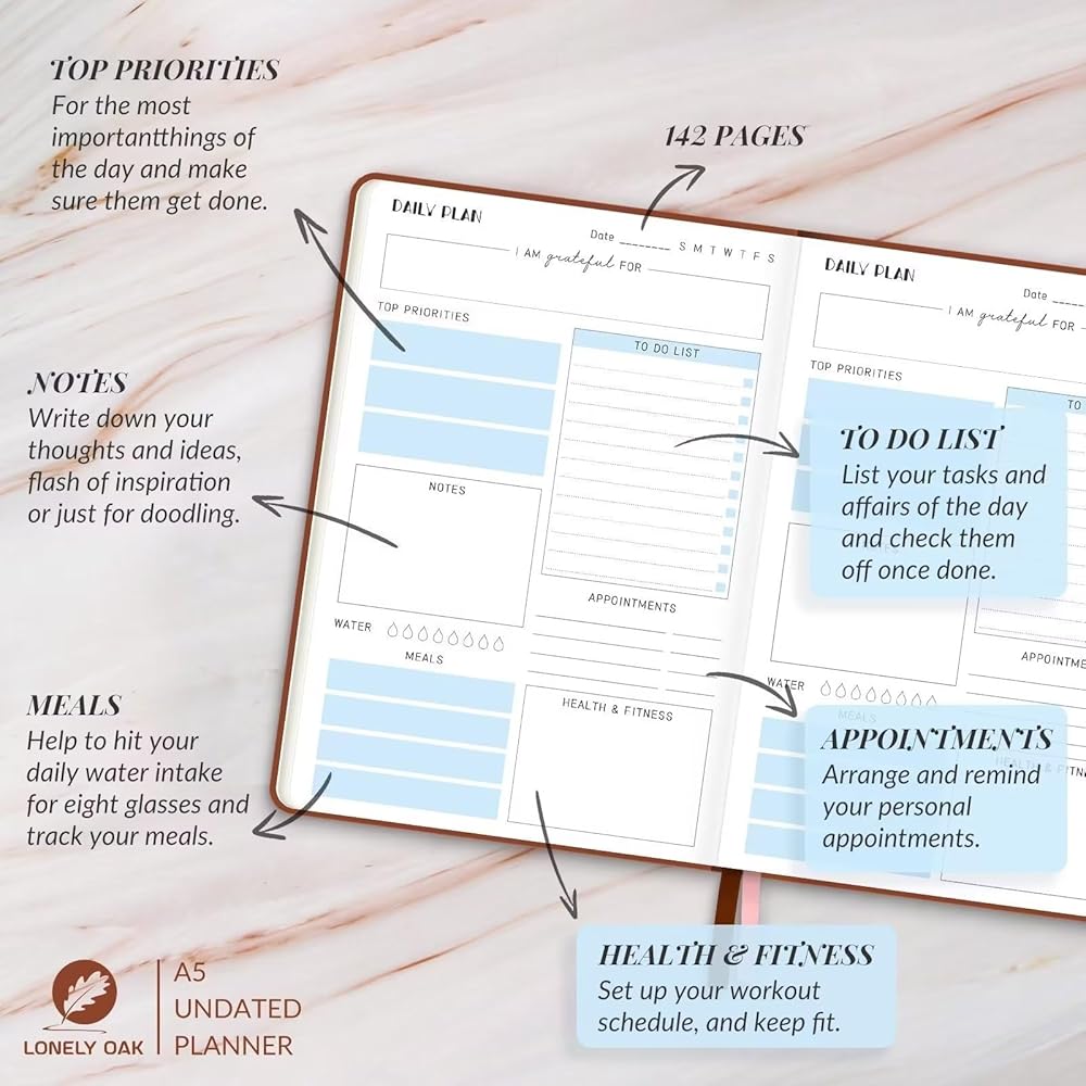 مخطط المهام غير محدد التاريخ - المخطط اليومي غير محدد، حتى 142 صفحة لجدول أعمالك اليومي. إذا فاتتك يومًا أو كنت خارج العمل في ذلك اليوم، فلن تحتاج إلى إضاعة صفحة. فقط ابدأ في أي وقت.