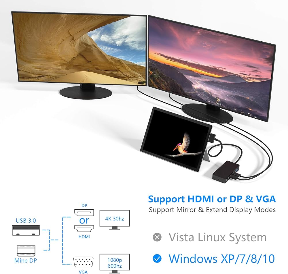 ✔️[محور Surface pro مرن للشاشة الثلاثية] شاشة ثلاثية (HDMI+VGA أو HDMI+DP أو DP+ VGA) + أوضاع السطح تعزز كفاءتك 3 مرات، 4K HDMI + 4K DisplayPort تدعم دقة تصل إلى 3840 x 2160@30 هرتز. يدعم منفذ VGA دقة عرض تصل إلى 1920 × 1080 عند 60 هرتز. يتوفر إخراج 3840 × 2160 فقط عند استخدام شاشة HDMI أو DP أو مرآة الشاشتين. إذا تم توصيل شاشتين لتمديد الشاشة، فستقتصر كل منهما على دقة قصوى تبلغ 1080 بكسل.