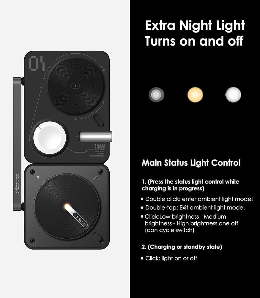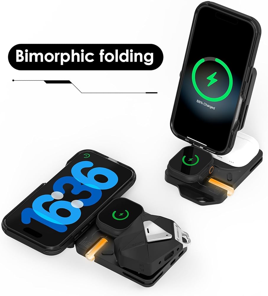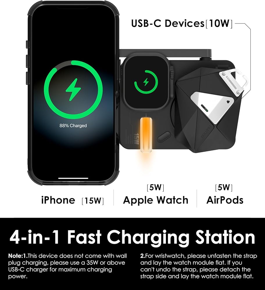 شحن لاسلكي 3 في 1: اشحن هاتفك المحمول وسماعات الرأس والساعة الذكية في نفس الوقت، وهو متوافق مع وظيفة Magsafe، ويأتي مع منفذ إخراج USB-C إضافي.