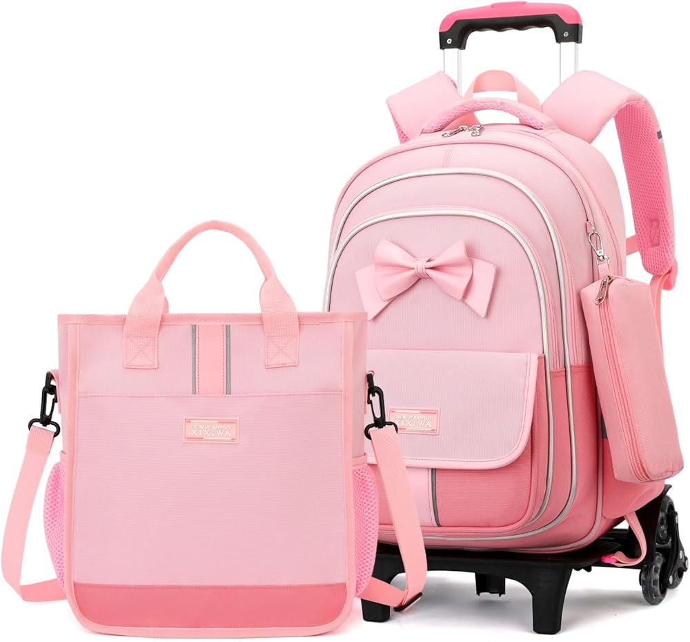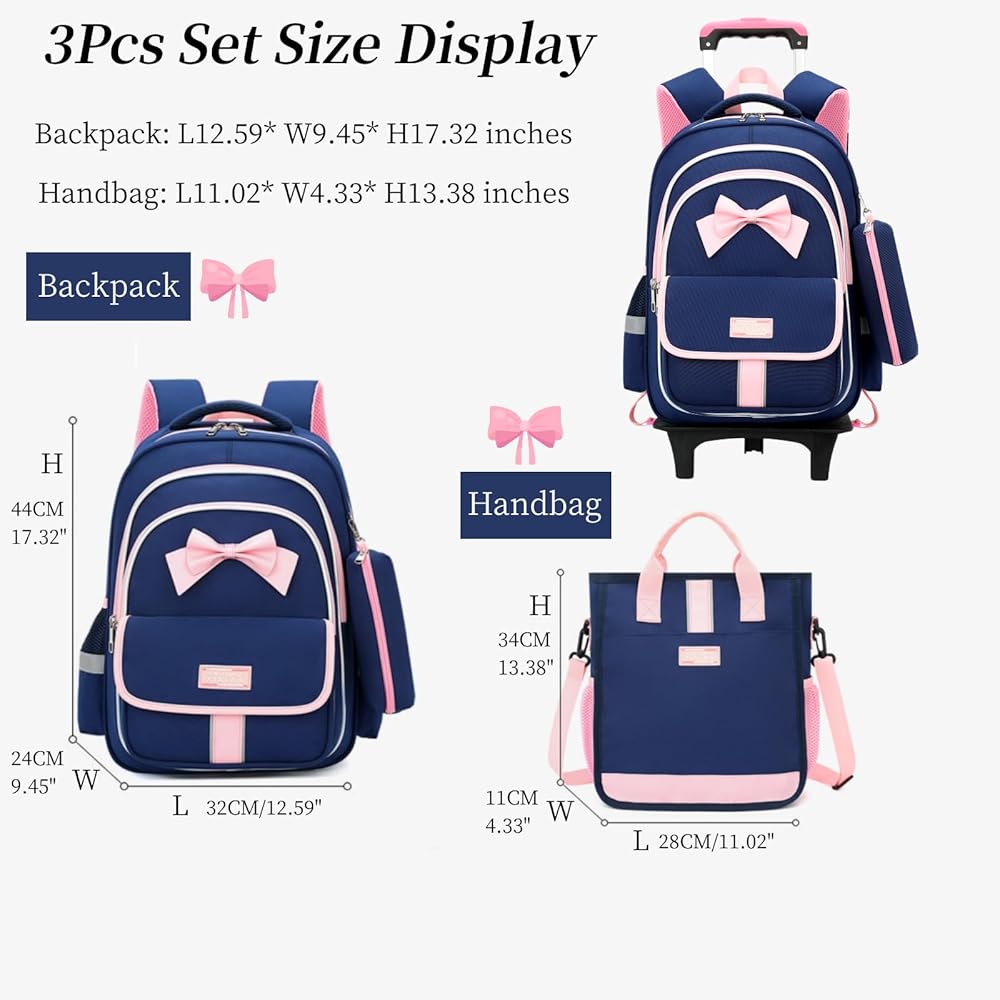 🎀【مادة حقيبة ظهر للفتيات بعجلات】حقيبة الظهر المتدحرجة للفتيات مصنوعة من نسيج نايلون مقاوم للماء، تحمي بشكل أفضل العناصر الموجودة في حقيبة الظهر من البلل، وسهلة التنظيف، ومتينة، وحقيبة مدرسية بعجلات للأطفال مع سحابات ناعمة، وعجلات مقاومة للاهتراء، وقابلة للسحب. مقبض معدني، لوحة دعم قابلة للطي، سيحب الأطفال استخدام حقيبة الظهر المتدحرجة للفتيات على العجلات