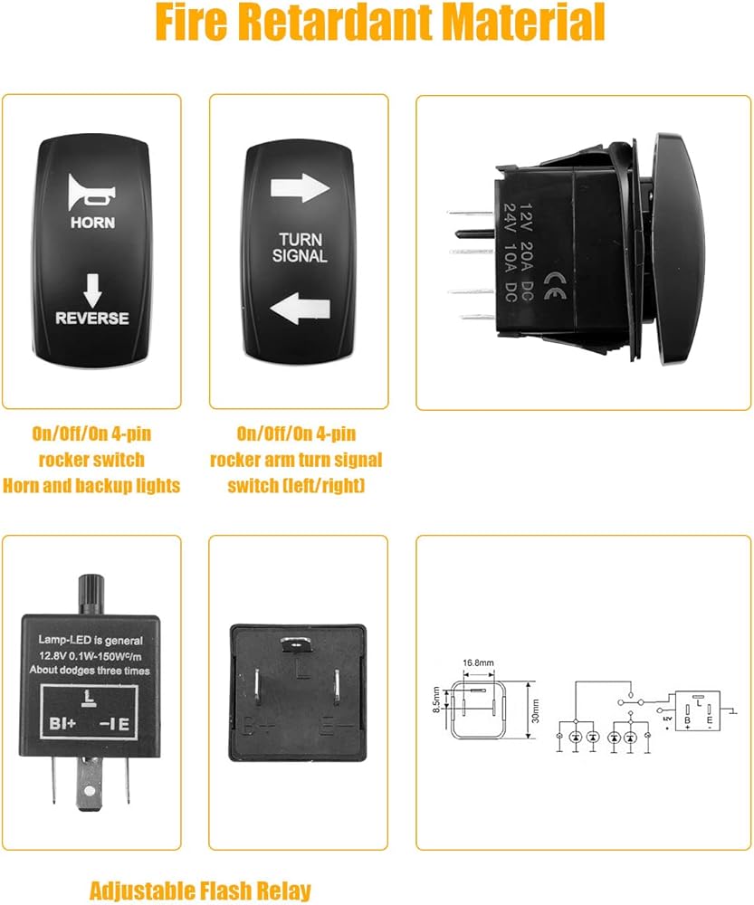 مجموعة إشارة الانعطاف للدراجة النارية: تتضمن: 2 مصباح LED كهرماني أمامي، 2 مصباح LED أحمر خلفي، 2 مصباح LED أبيض، 2 مصباح عكسي LED أبيض، 1 قرن، 1 مرحل ومضي قابل للتعديل، 1 تشغيل/إيقاف/تشغيل 4-PIN إشارة الانعطاف الهزازة مفتاح (يسار/يمين)، 1 (تشغيل)/إيقاف/تشغيل مفتاح متأرجح ذو 4 سنون (للبوق والأضواء الاحتياطية)، 1 مصهر