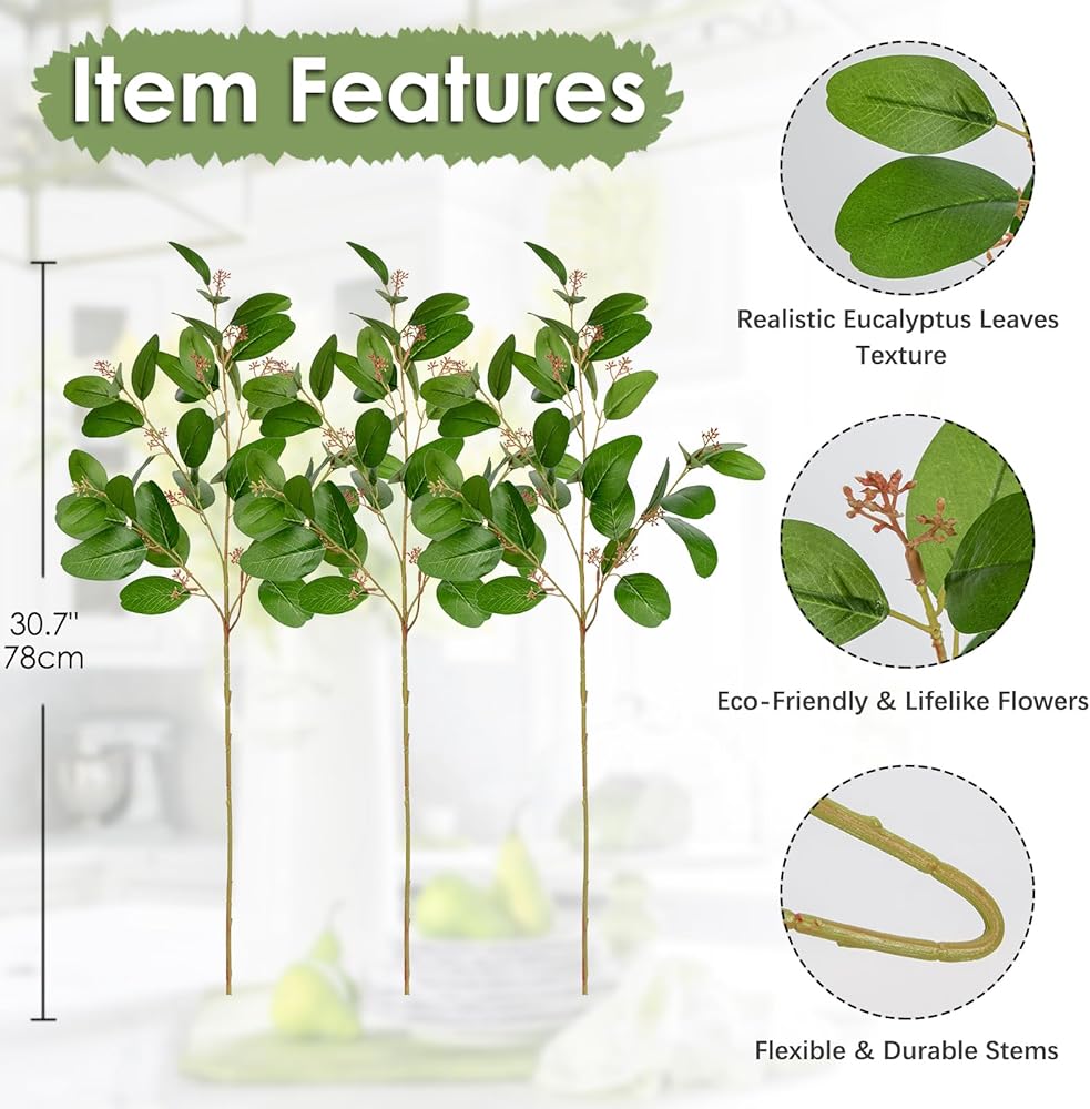 حجم مثالي - 3 قطع سيقان الأوكالبتوس الحريرية، الطول الإجمالي لأوراق الخريف الصناعية هو 30.7 سم، يمكنك استخدام مقص لقص السيقان الخضراء الاصطناعية إلى الطول الذي تريده. من السهل إعادة تشكيل أوراق الأوكالبتوس المزيفة، فقط تحتاج إلى إجراء بعض التعديلات بيديك لجعل سيقان النبات الصناعي تبدو أكثر رقة وطبيعية