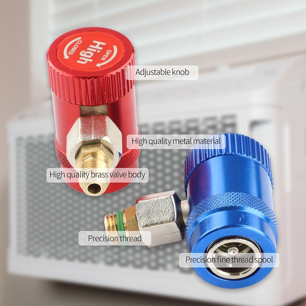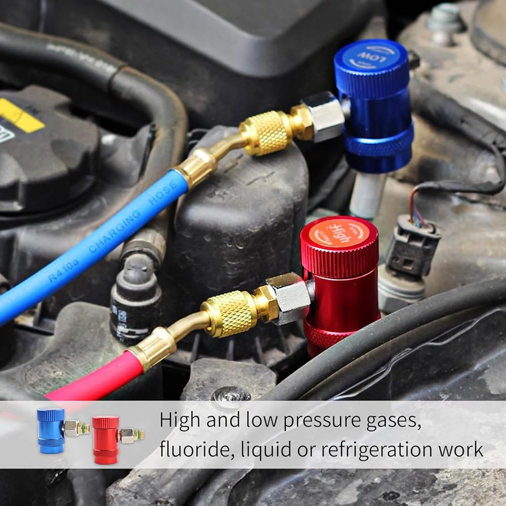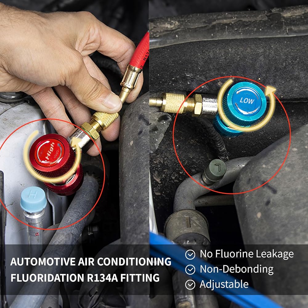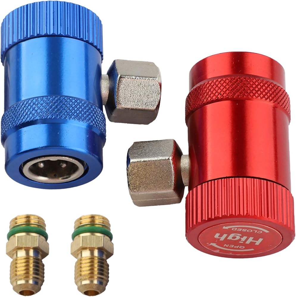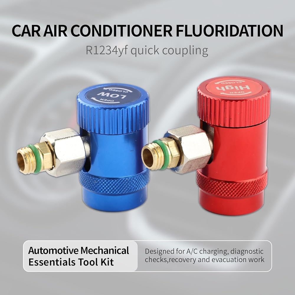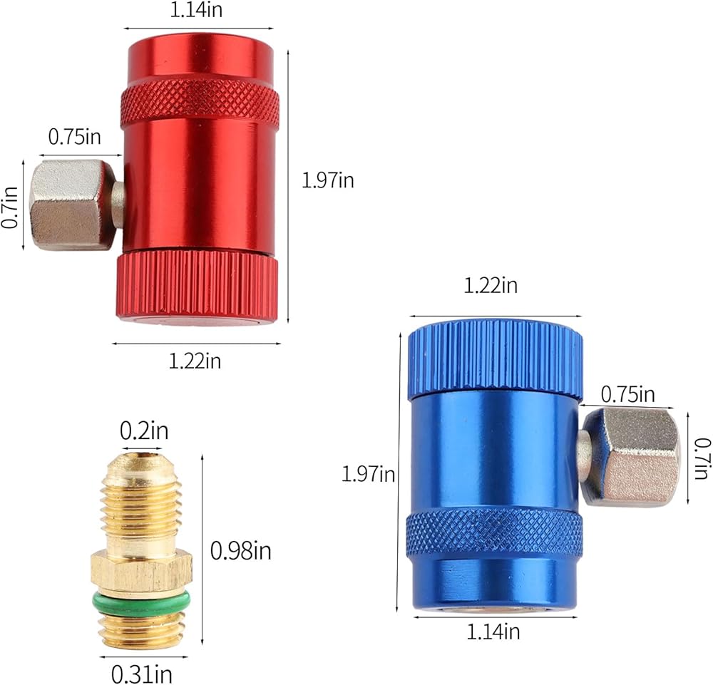 (1) محول الجانب المنخفض R1234YF - قارنة التوصيل السريعة ذات الجانب المنخفض R1234YF باللون الأزرق: قارنة التوصيل السريعة R1234yf ذات الجانب المنخفض 14 مم أنثى × 1/4 بوصة SAE ذكر. موصل المحول R12 إلى R134a: قارنة التوصيل السريعة 1/4 بوصة SAE × الضغط المنخفض 13 مم R134A.