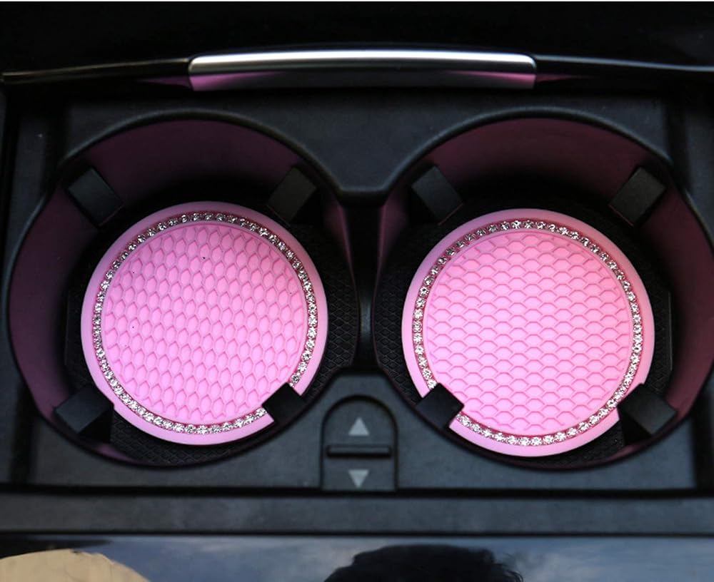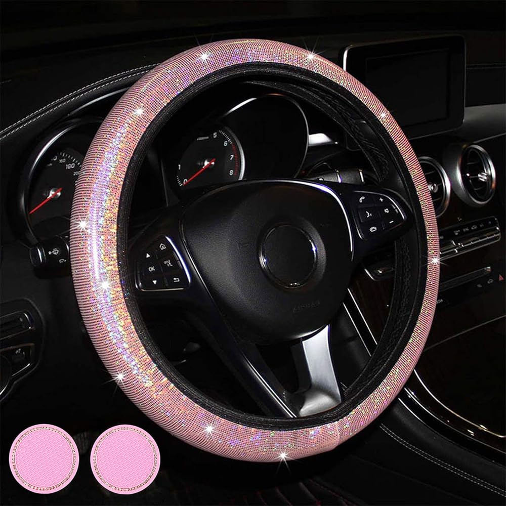 أغطية عجلة القيادة باللون الوردي للسيارة، غطاء عجلة القيادة اللامع القابل للتمدد للنساء والفتيات والرجال، ملحقات سيارة للفتيات مقاس 15 بوصة مع 2 قاعدة أكواب للسيارة لحاملي الأكواب