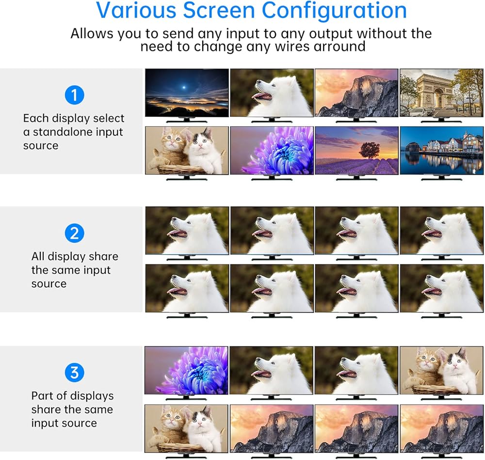 [𝟖 𝐈𝐧 𝟖 𝐎𝐮𝐭 𝐌𝐚𝐭𝐫𝐢𝐱] يربط Yinker 4K HDMI Matrix 8x8 8 مصادر إدخال HDMI ويساهم بها في 8 شاشات إخراج HDMI في وقت واحد أو بشكل فردي. يمكن استخدامه كمحول أو مقسم دون توصيل الكابلات وإخراجها.