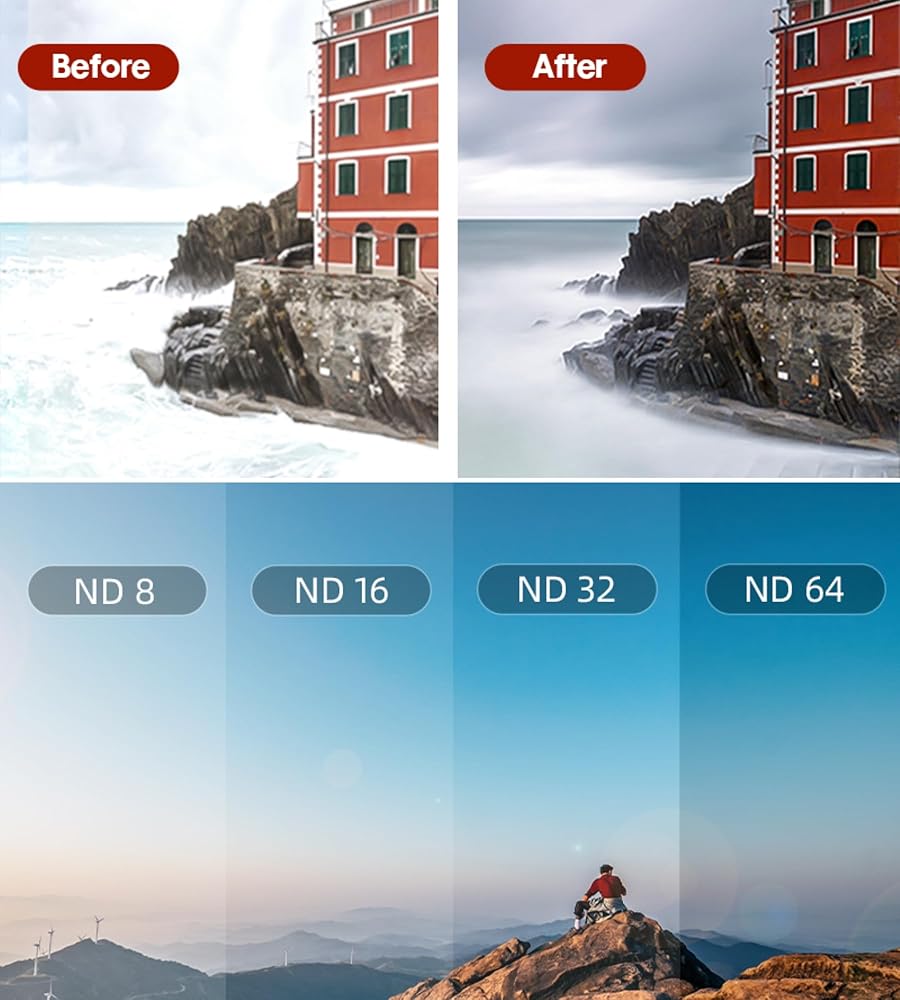 • 【مرشحات متعددة】يمكن لمرشحات ND تحسين قدرتك على التصوير الفوتوغرافي بشكل كبير: توفر مرشحات ND 8/16/32/64 مستويات 3/4/5/6 من تقليل الضوء على التوالي، تمنع مرشحات ND عدسة الطائرة بدون طيار التعرض الزائد في بيئات الإضاءة القوية، وتقاوم الضوء المتناثر ، وزيادة تشبع اللون، وجعل الصورة أكثر شفافية وتألق.