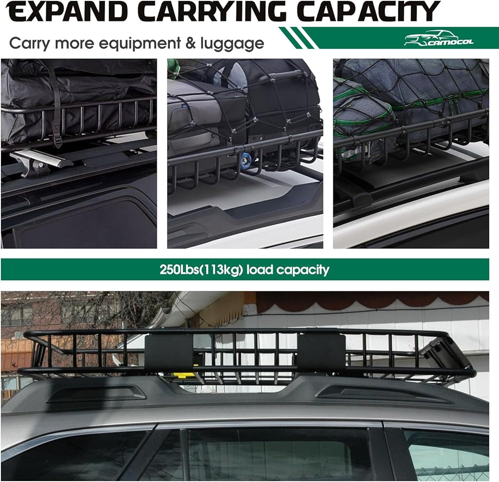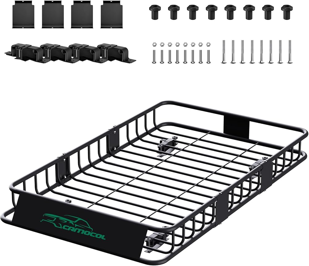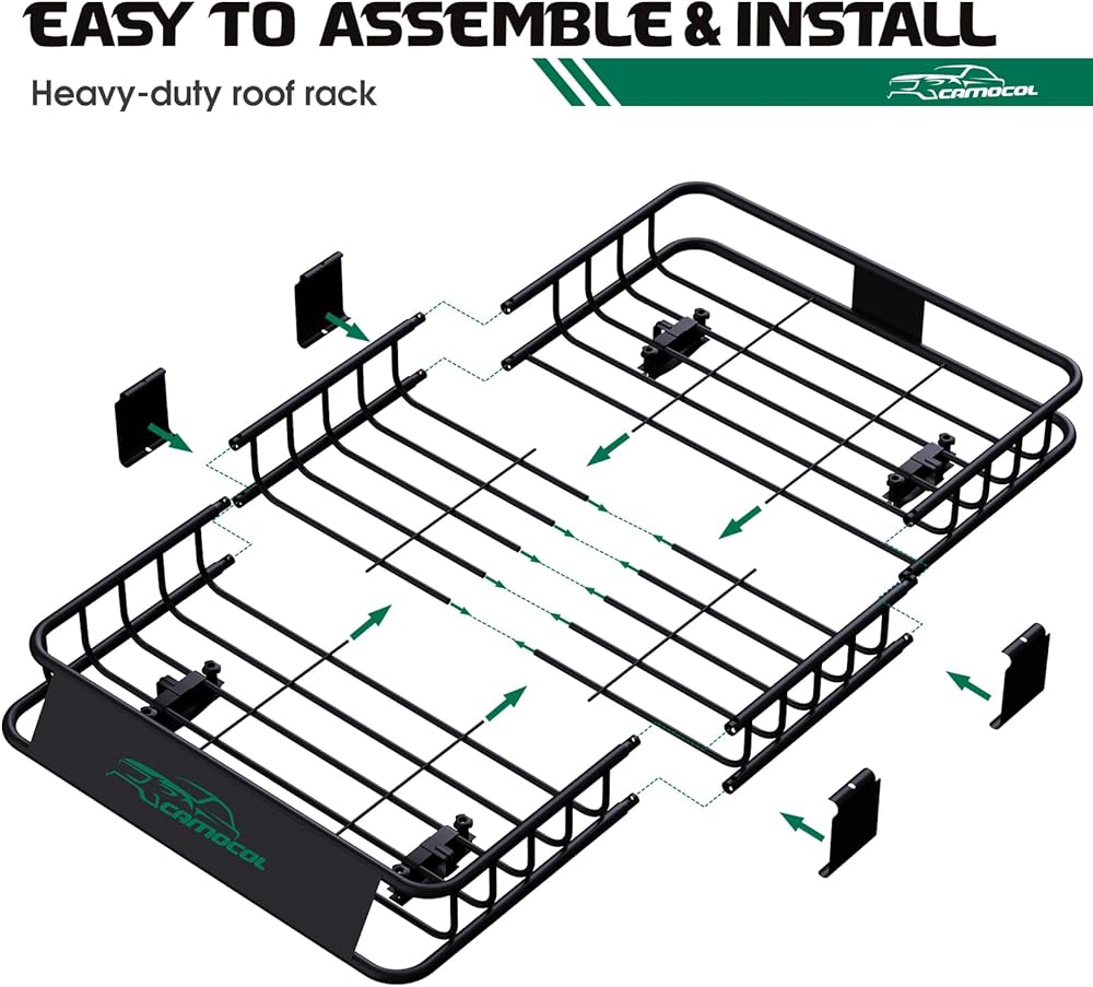 【هيكل عالي التحمل】السلامة أولاً! رف البضائع CAMOCOL مصنوع من الفولاذ عالي التحمل لمزيد من القوة ومقاومة الطقس، مما يوفر عدة سنوات من الاستخدام طويل الأمد. ستحافظ القضبان الجانبية المعدنية العالية مقاس 6 بوصات الموجودة في سلال رفوف السقف لدينا على أمان أغراضك أثناء السفر