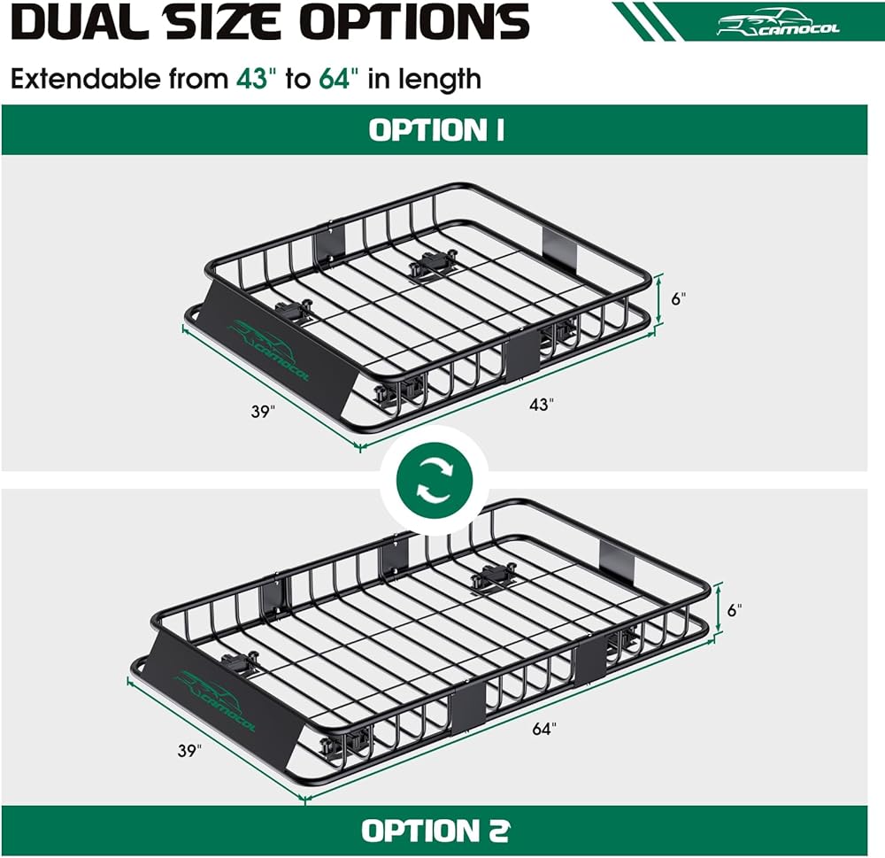 【سعة كبيرة】احصل على مساحة واسعة إضافية تبلغ 10 أو 13 قدمًا مربعًا أعلى سيارتك مع رف سقف سلة البضائع هذا! مصممة بسعة وزن 150 رطلاً؛ تمكين نقل البضائع الثقيلة