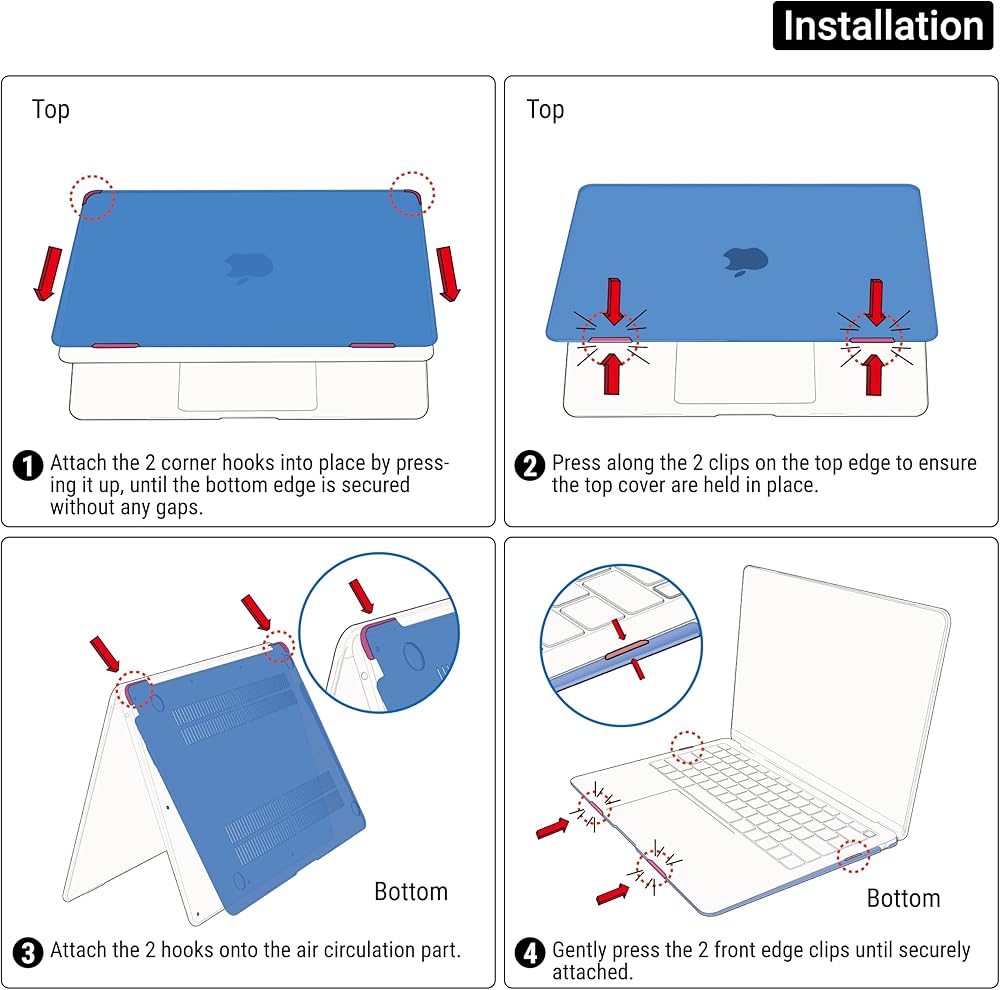 سهولة التركيب والإزالة: تم تصميم الجراب الصلب الخاص بنا بدقة للتركيب والإزالة بسهولة على طراز MacBook Air 15 بوصة M2. مع المشابك الصغيرة التي يتم تثبيتها بشكل آمن على الكمبيوتر المحمول الخاص بك، يمكنك الاستمتاع بتجربة خالية من المتاعب. توفر المشابك ملاءمة آمنة بينما تسمح بسهولة الإزالة عند الضرورة.