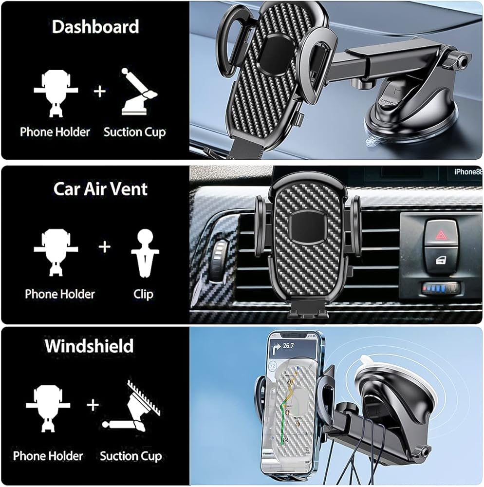 • حامل هاتف عالمي 3 في 1: يمكن تركيب حامل الهاتف الخلوي للسيارة على لوحة القيادة والنافذة وفتحة تهوية السيارة ومكتب المكتب بسهولة. ويتيح لك زر التحرير السريع تشغيل الهاتف بيد واحدة. تتضمن العبوة 1 × حامل هاتف عالمي للسيارة، 1 × مشبك فتحة تهوية مطور، يلبي احتياجاتك في مناسبات مختلفة.