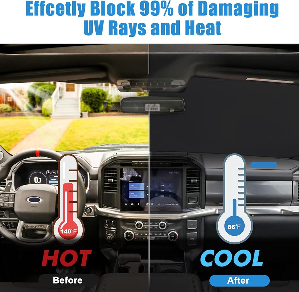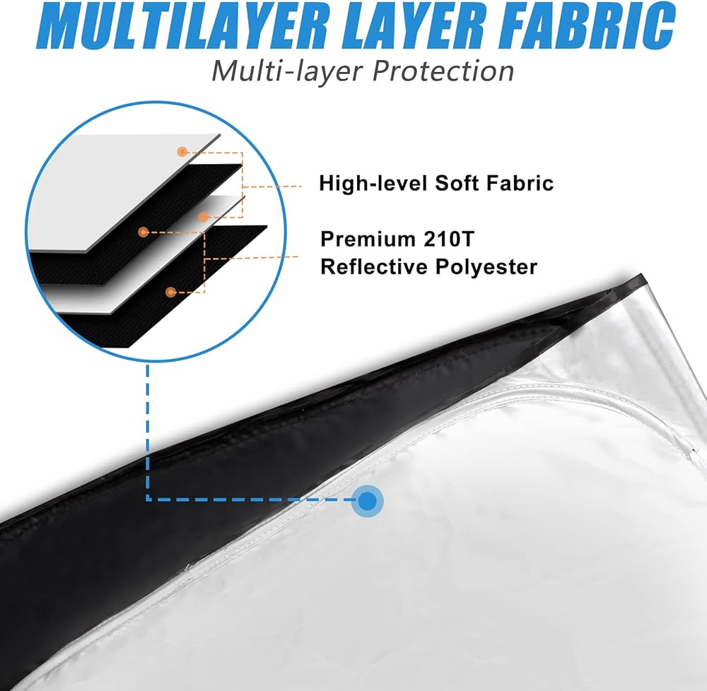 🚗 حماية فائقة - تتميز مظلة الشمس الخاصة بنا بعزل حراري مكون من طبقتين وعامل حماية من الشمس بنسبة 99%، مما يقلل بشكل فعال من درجة الحرارة داخل سيارتك ويمنع 99% من أشعة الشمس والأشعة فوق البنفسجية من الدخول. يحافظ على برودة مقاعد سيارتك ويحمي الجزء الداخلي لسيارتك من الأشعة فوق البنفسجية الضارة.