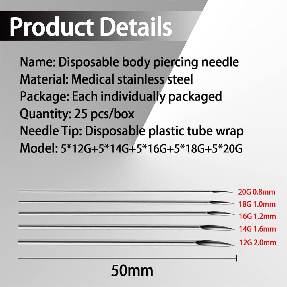 25 قطعة من إبر الثقب المختلطة، 12 جرام 14 جرام 16 جرام 18 جرام 20 جرام 5 قطع من كل إبرة ثقب الجسم المعقمة المصنوعة من الفولاذ المقاوم للصدأ للاستعمال مرة واحدة للأنف والشفاه والحاجز والأذن وثقب الحاجب