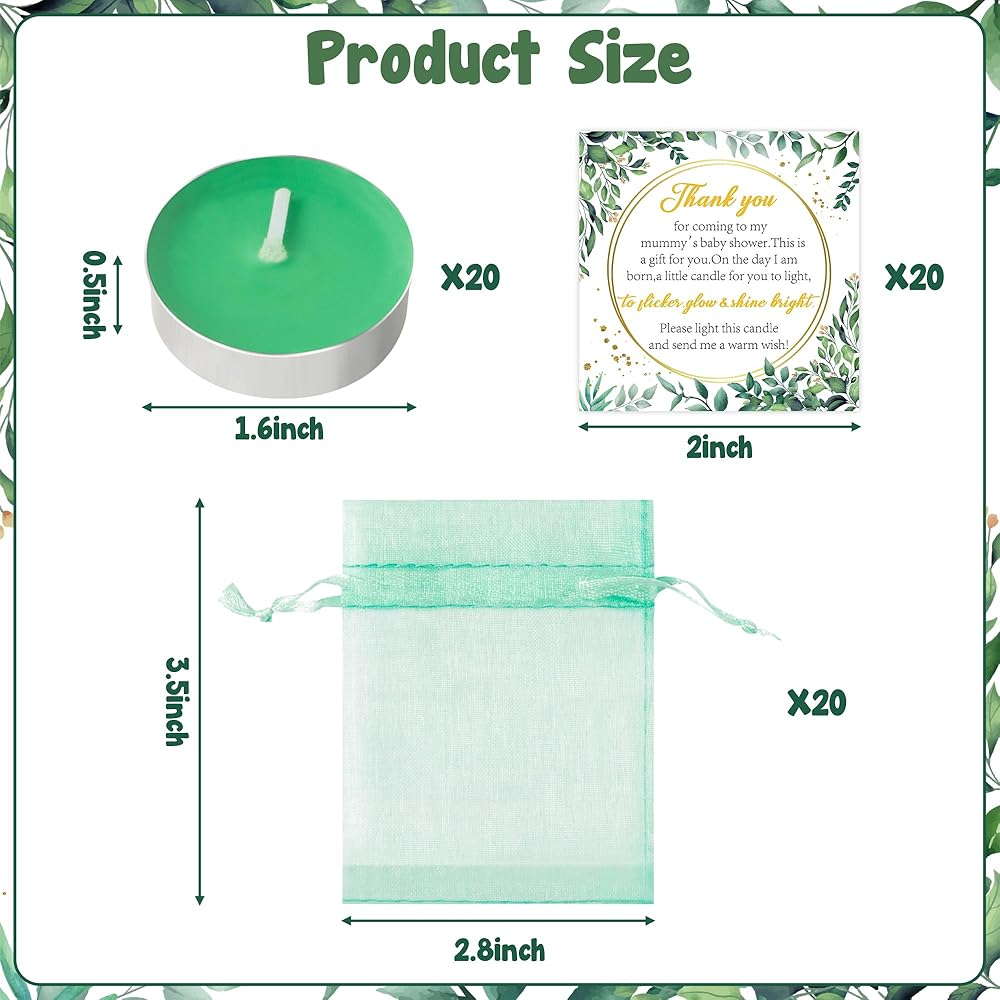 العبوة القيمة: تحتوي مجموعتنا على 20 شمعة رائعة باللون الرمادي والأخضر، و20 كيس هدايا رقيق باللون الأخضر المائي، و20 بطاقة شكر. ارفع أجواء حفل استقبال مولودك باستخدام شموعنا الخفيفة، مما يضمن إعداد حفل متطور وأنيق وشكر الضيوف على حضورهم الحفل.