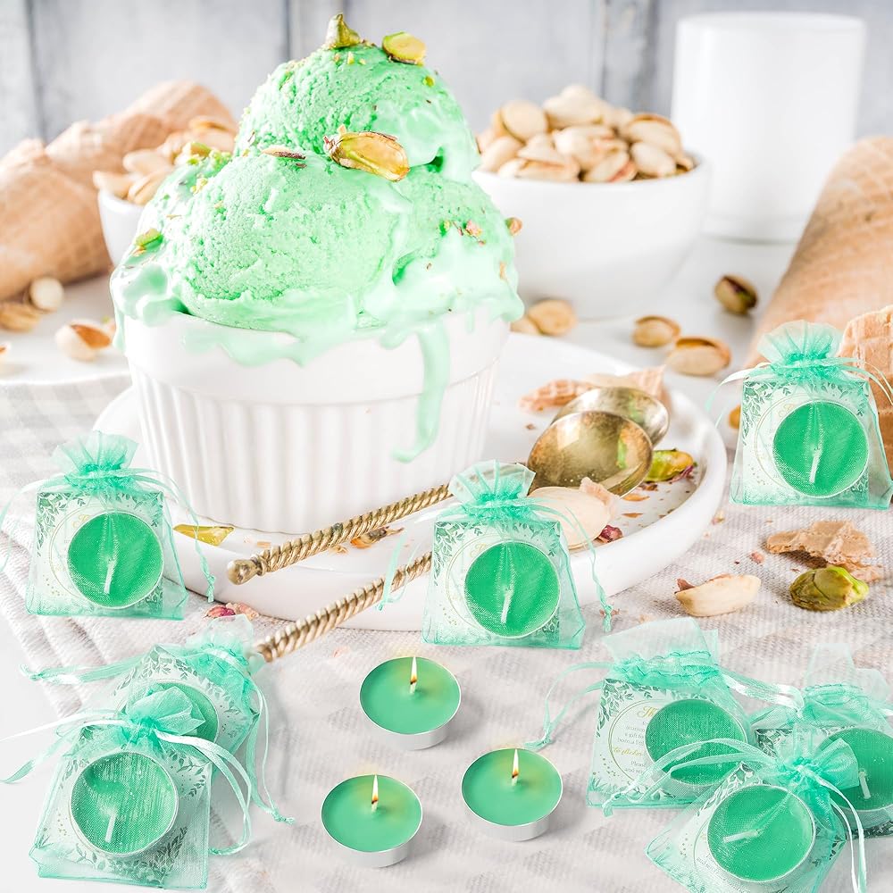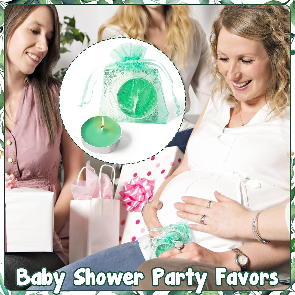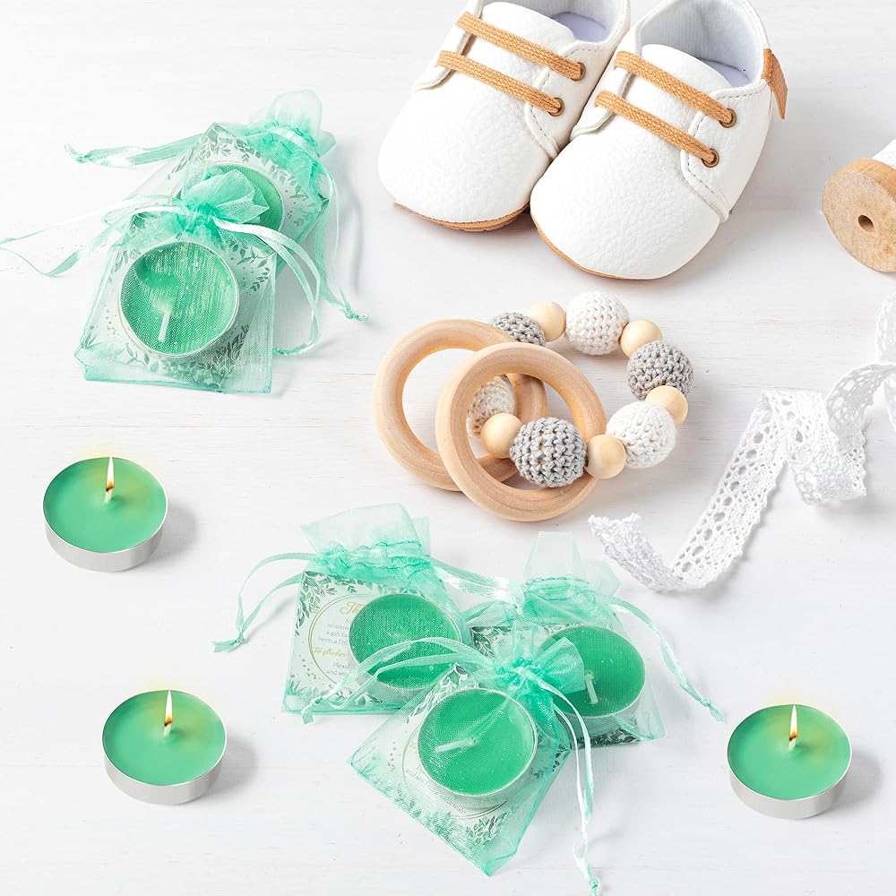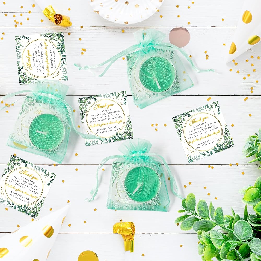 المواد: شموع الشاي الخفيفة الخاصة بنا مصنوعة من شمع عالي الجودة، مما يضمن حرقًا نظيفًا ويدوم طويلاً. مع أكياس الهدايا باللون الأخضر المائي وبطاقات الشكر كهدية نهاية الحفلة لضيوفك، اجعل ضيوفك يتمتعون بتجربة احتفالية لا تُنسى.