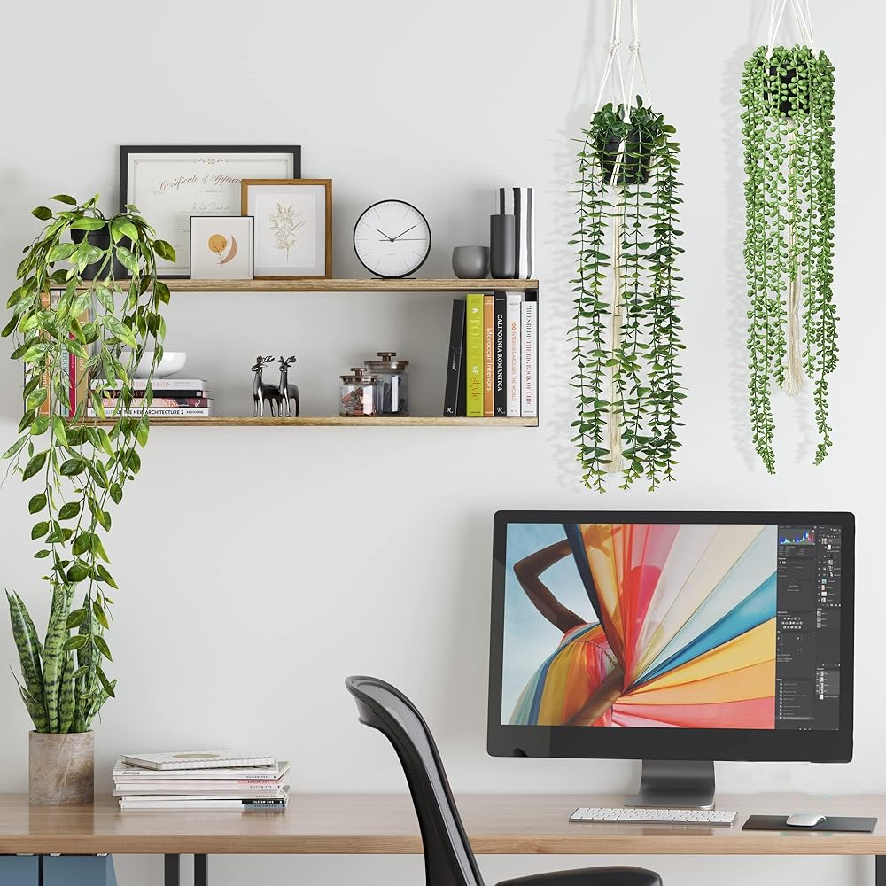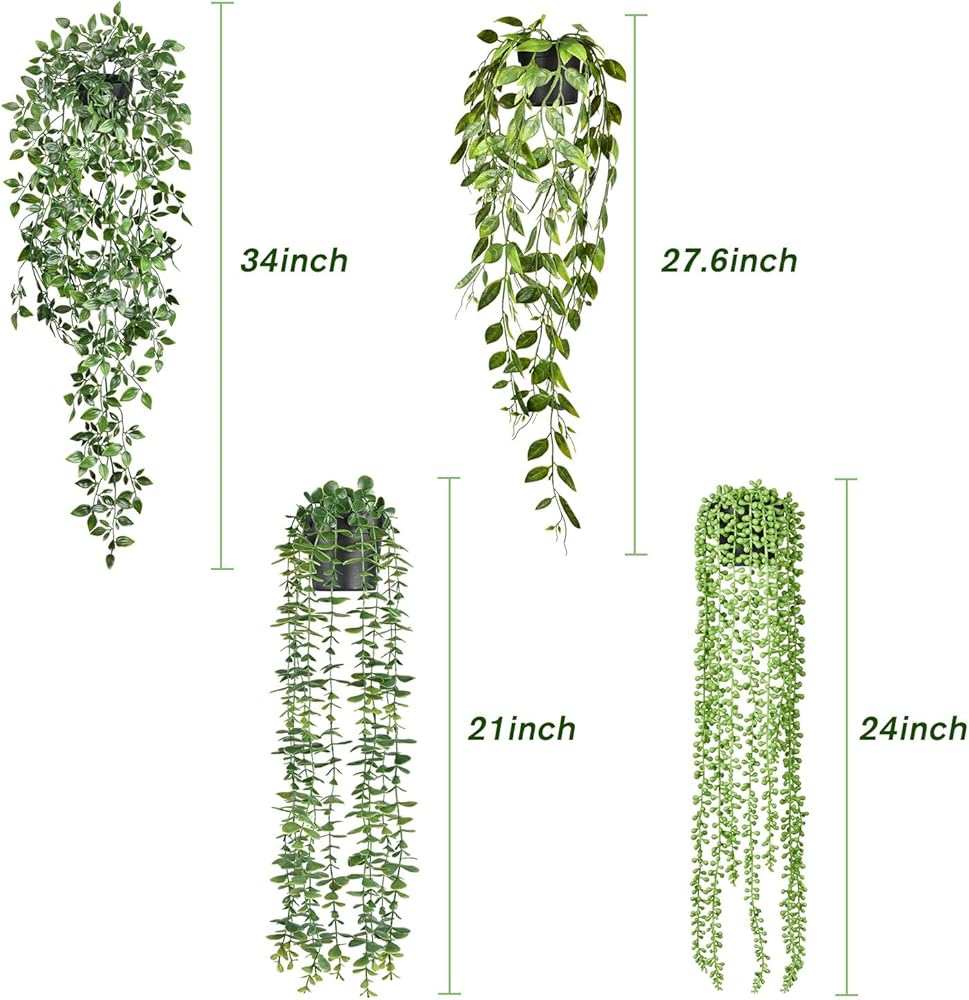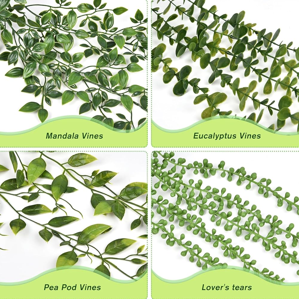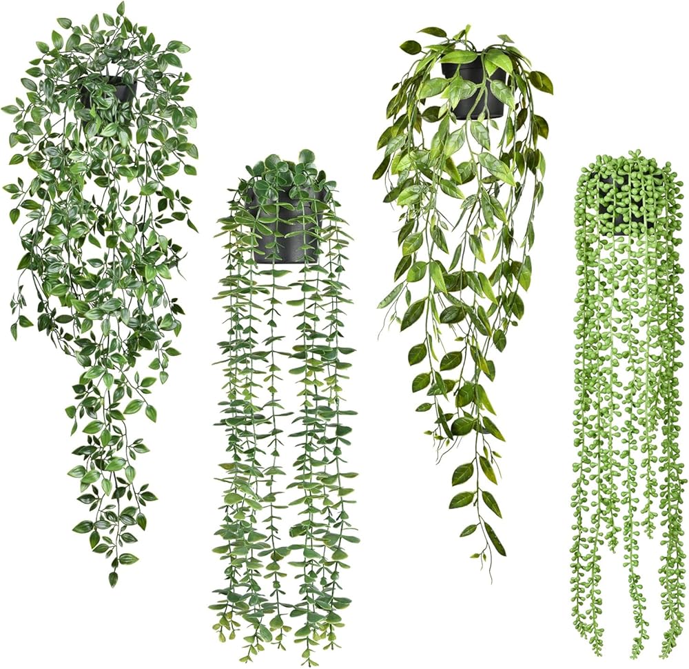 DearHouse 4 عبوات من النباتات الاصطناعية المعلقة، نبات معلق وهمي، كرمة الأوكالبتوس الخضراء بوعاء صناعي، كرمة ماندالا، سلسلة من اللؤلؤ، أوراق البازلاء في وعاء لغرفة المنزل وديكور الرف الداخلي والخارجي